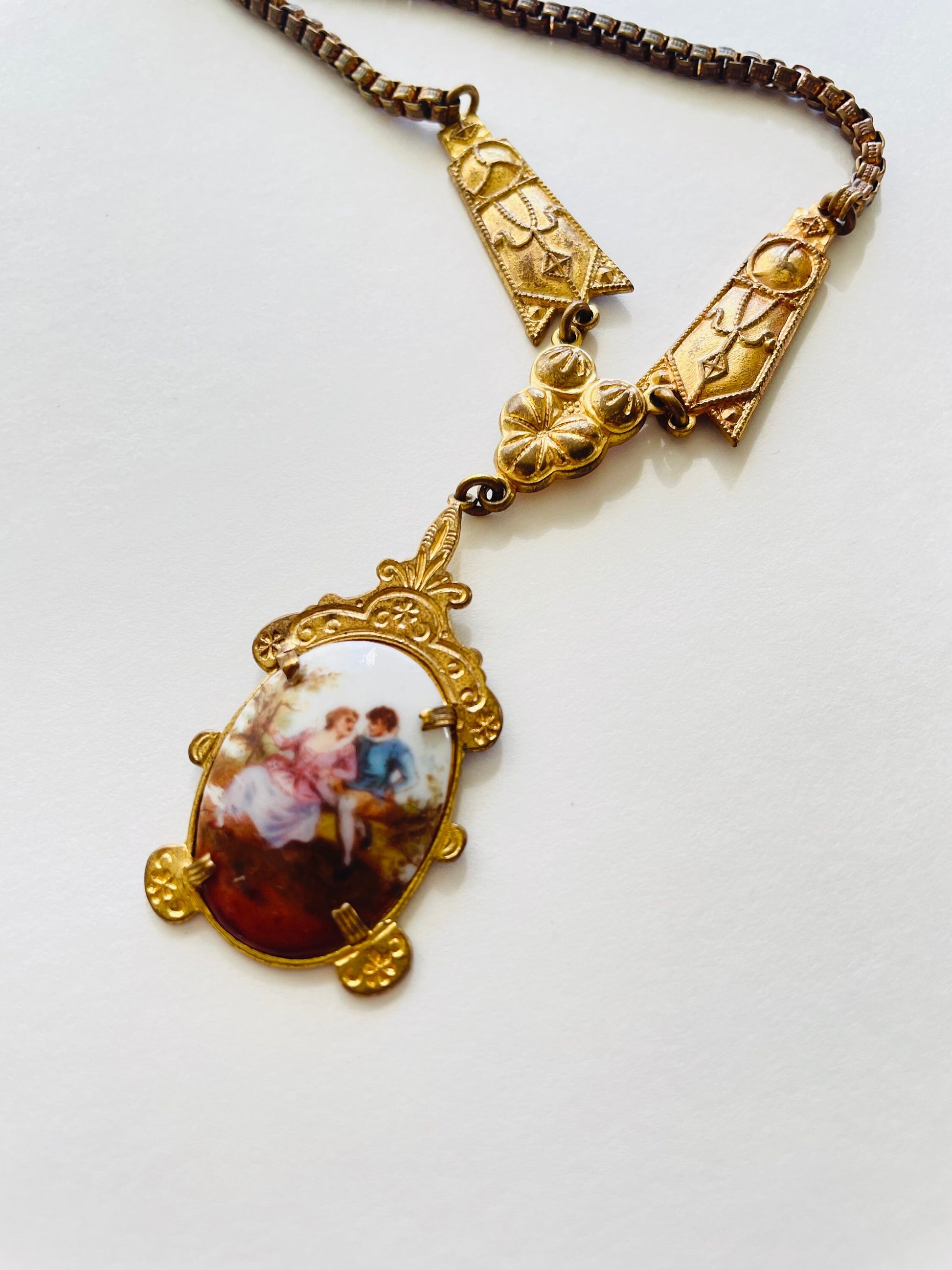 ~ 1920s Beautiful antique style gold necklace ~ Porcelain pendant necklace ~ Victorian couple in a garden ~ Brass book chain necklace ~ Excellent Length when held 11” (27.94 cm) Length- 17.5” (44.45 cm) Pendant- 2.25” (5.71 cm) Additional Vintage Jewelry in our sister shop Glenna's Jewels: http://glennasjewels.etsy.com More Incredible Vintage: http://glennasvintageshop.etsy.com Instagram @glennas_clothing Facebook https://www.facebook.com/glennasclothing