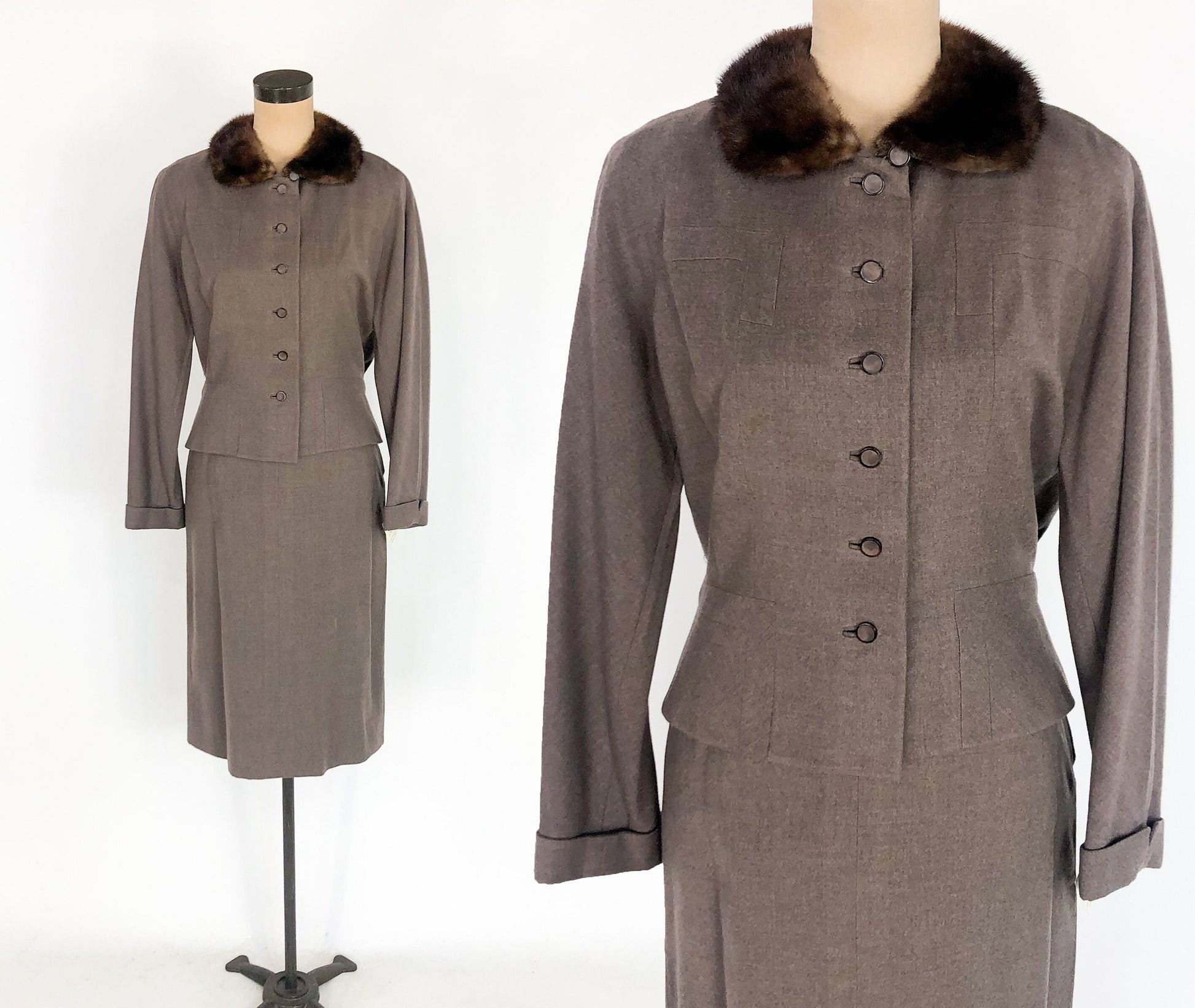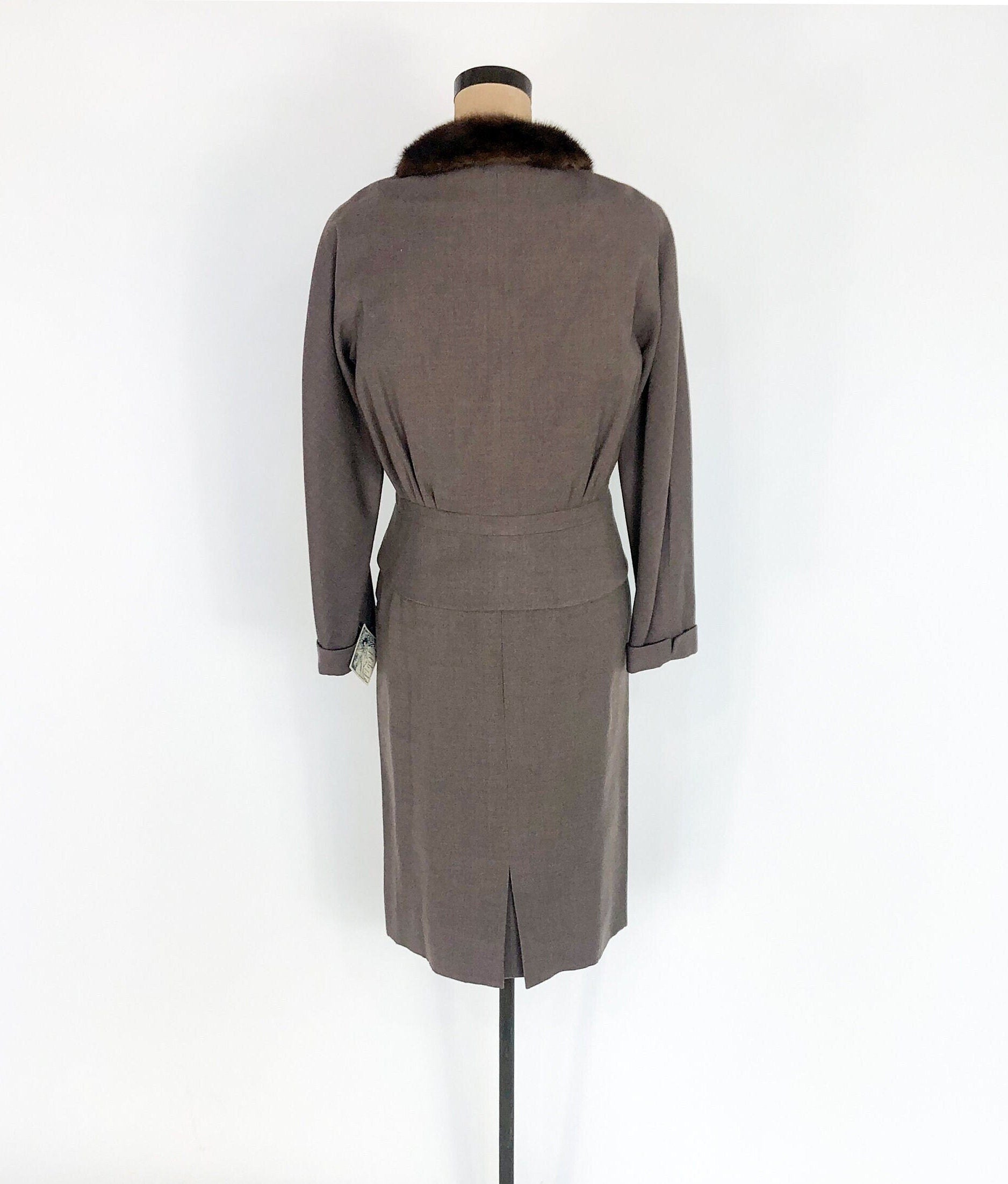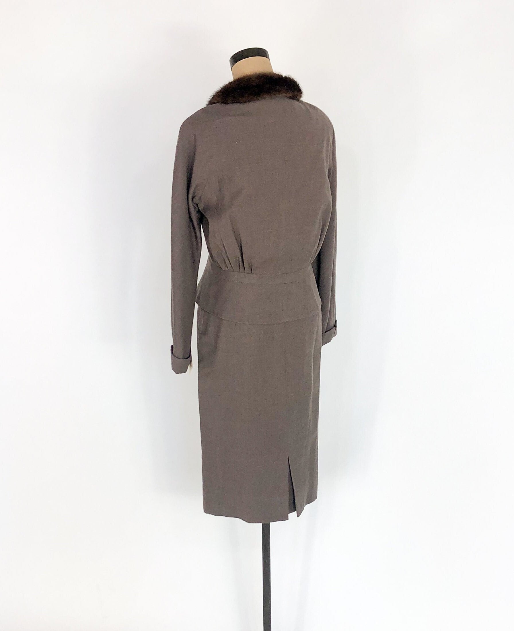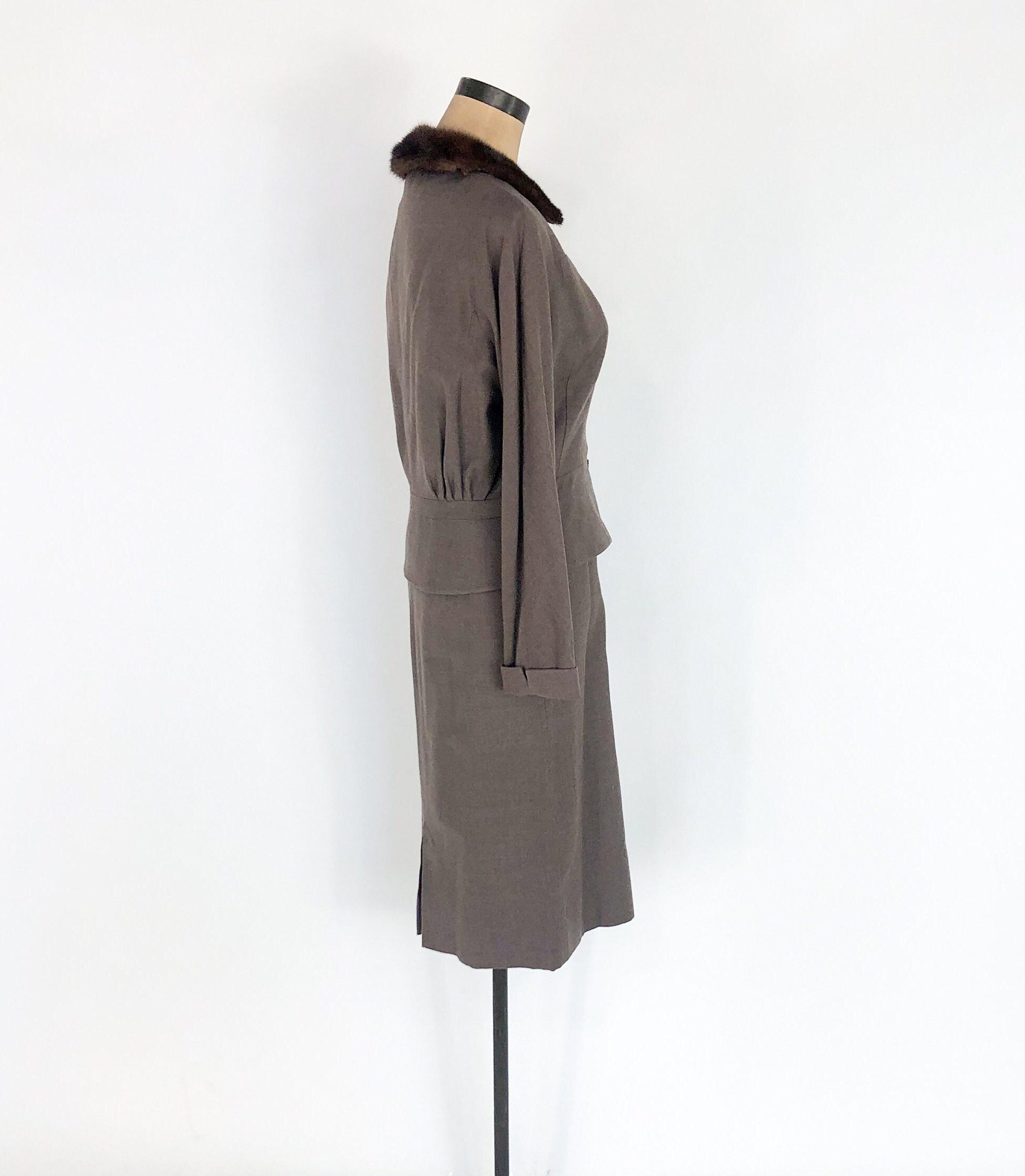 ~ 1940s lovely taupe brown wool suit ~ Luxurious mink fur collar ~ Buttons up the front of the jacket ~ Cute cuffed sleeves ~ Front faux pocket details at the hips ~ Notice gathered fullness at waist in back ~ Pencil skirt with 7" metal zipper ~ Crepe lining in jacket and part of skirt ~ Excellent Label: Union Label Jacket Bust- up to 40" (101.5 cm) Shoulder to Sh-1 6" (40.5 cm) Waist- 30" (76 cm) Length- 20" (51 cm) Sleeve- 22" (56 cm) Skirt Waist- 26"( 66 cm) Hips- 36" (91.5 cm) Length- 27" (68.5 cm) More Incredible Vintage: glennasvintageshop.etsy.com Vintage Jewelry: glennasjewels.etsy.com Instagram @glennas_clothing Facebook https://www.facebook.com/glennasclothing Model Info: Size 2, Height 5'6" (166 cm), Bust 32" (81.5 cm), Waist 26" (66 cm), Hips 37" (94 cm)