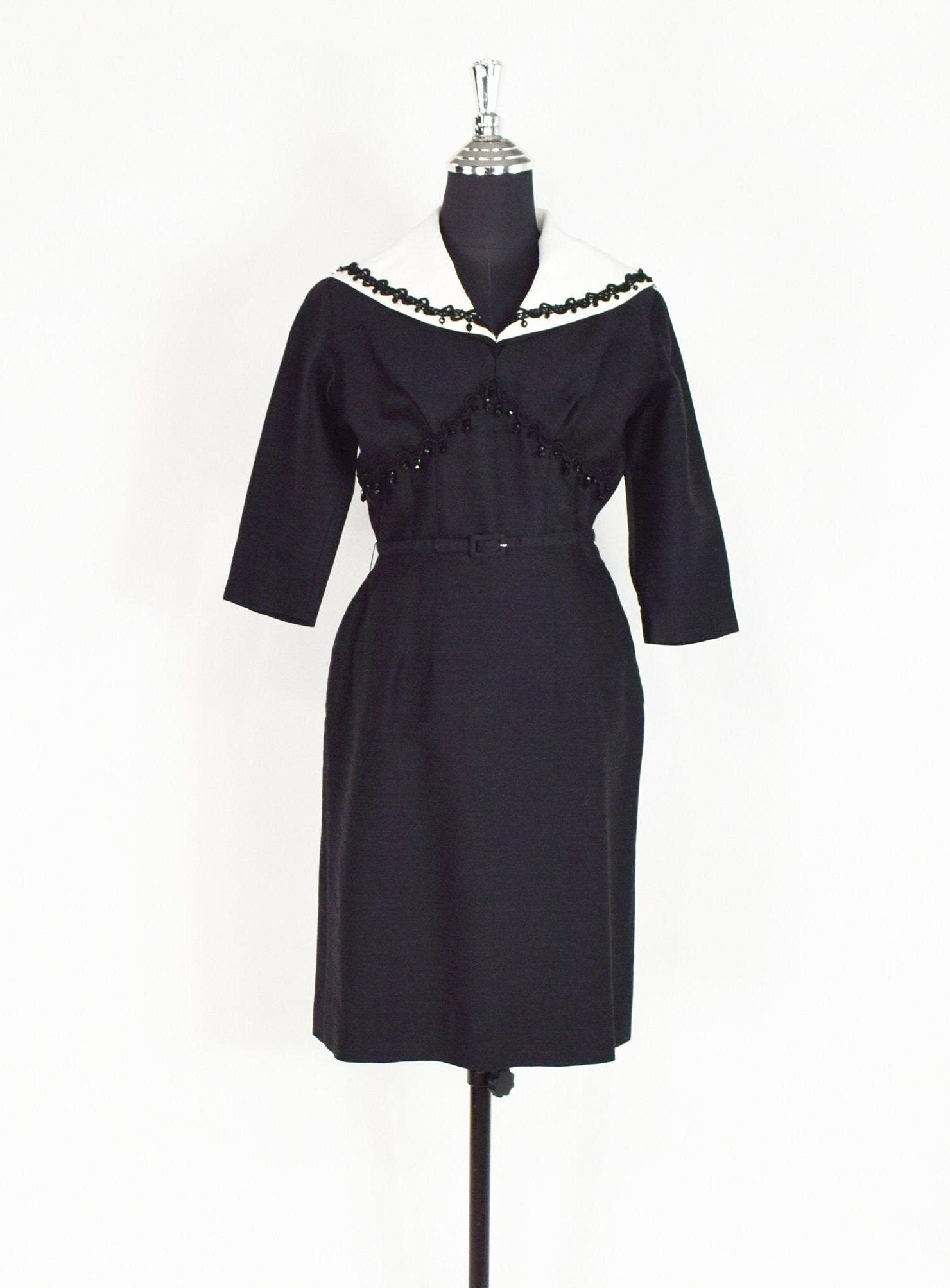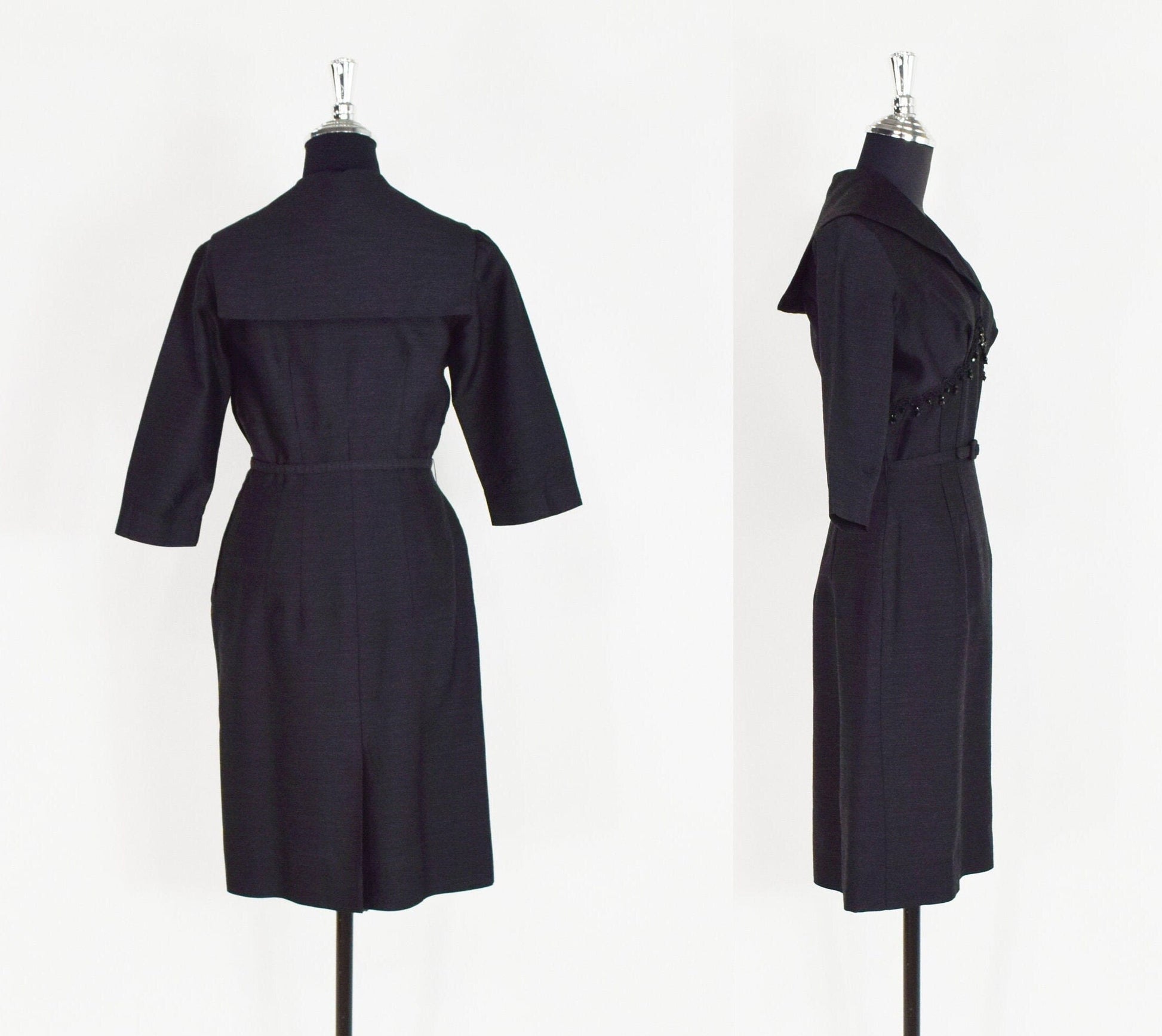 1940s Charcoal Gray Wool Dress with Collar | 40s Black Secretary Dress | White Removable Collar | Day to Night Dress | Chumley | Medium