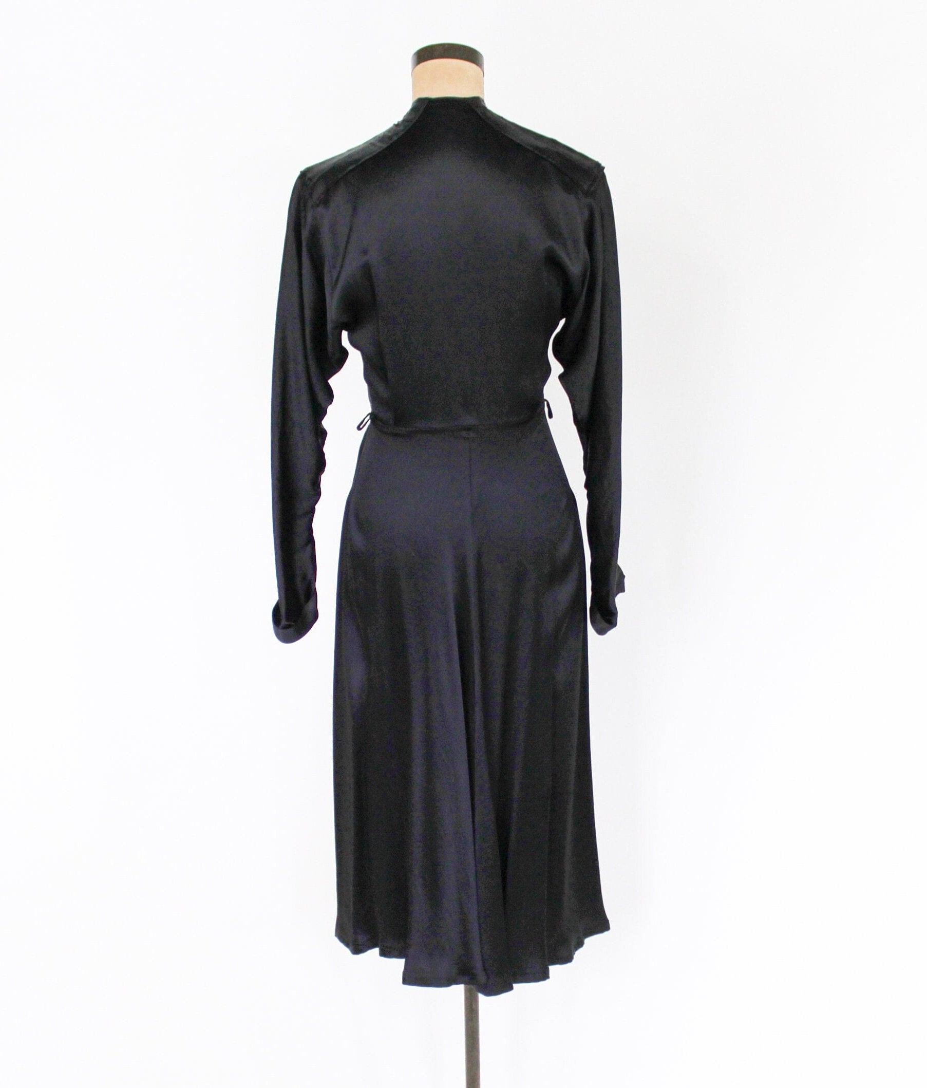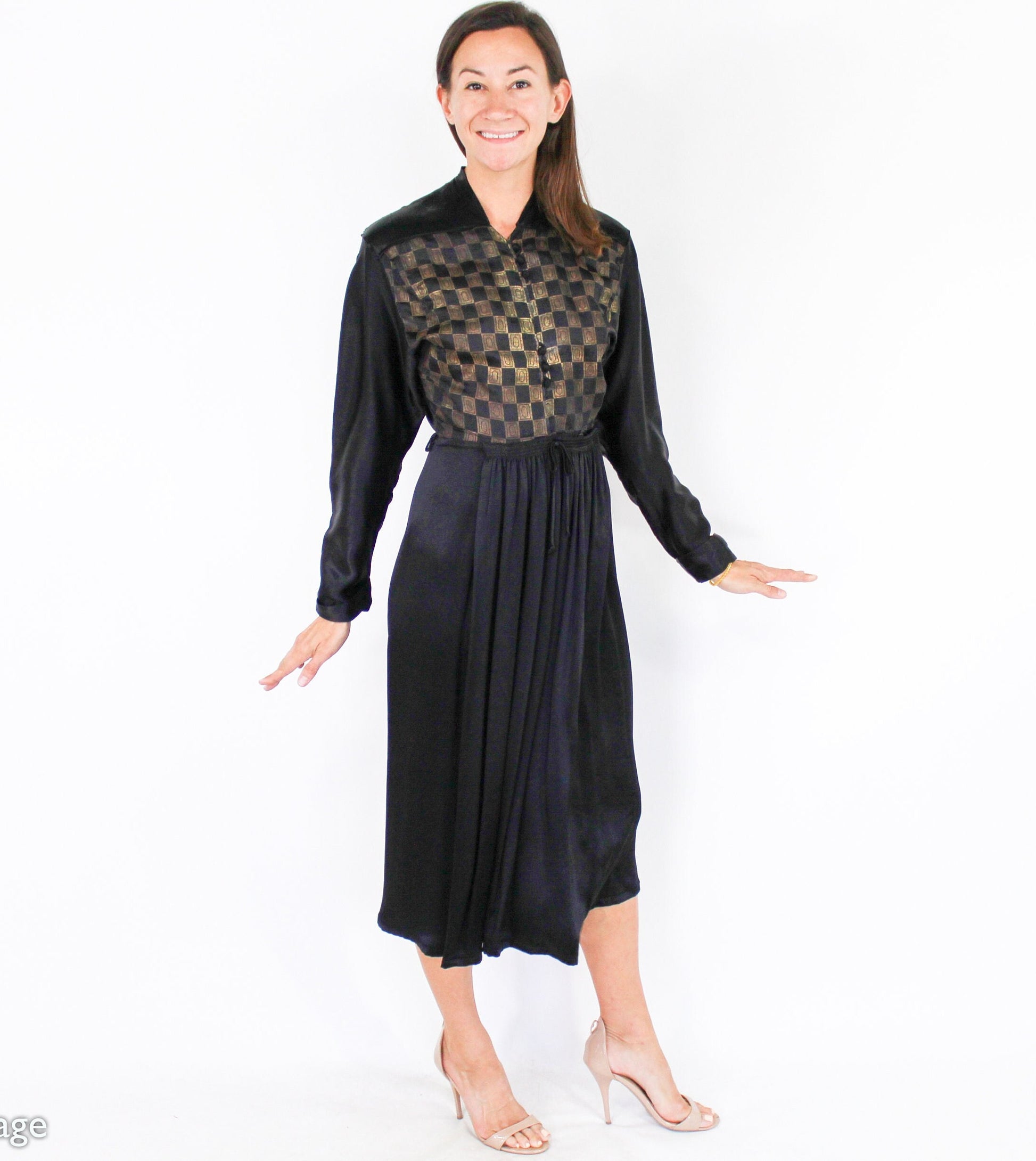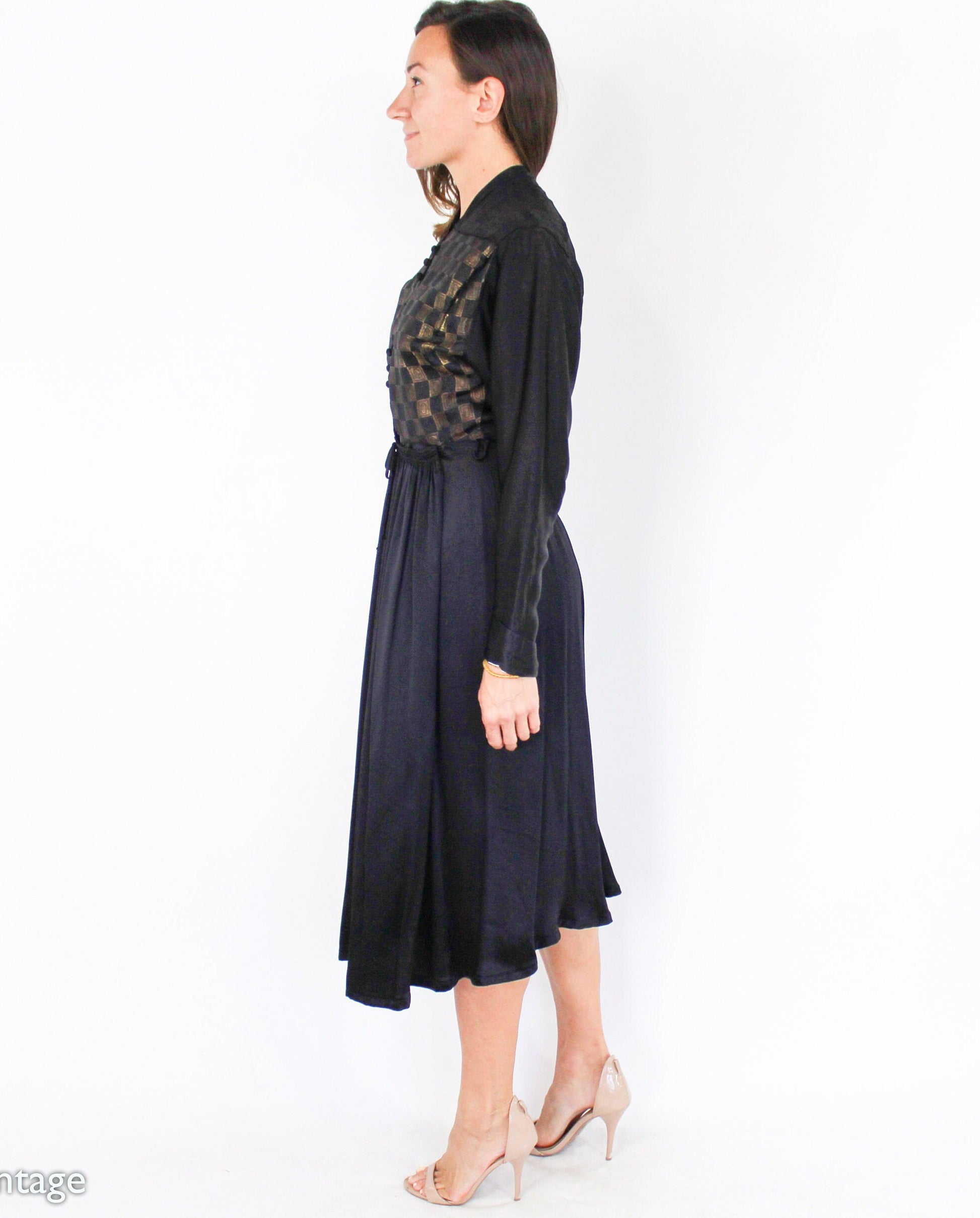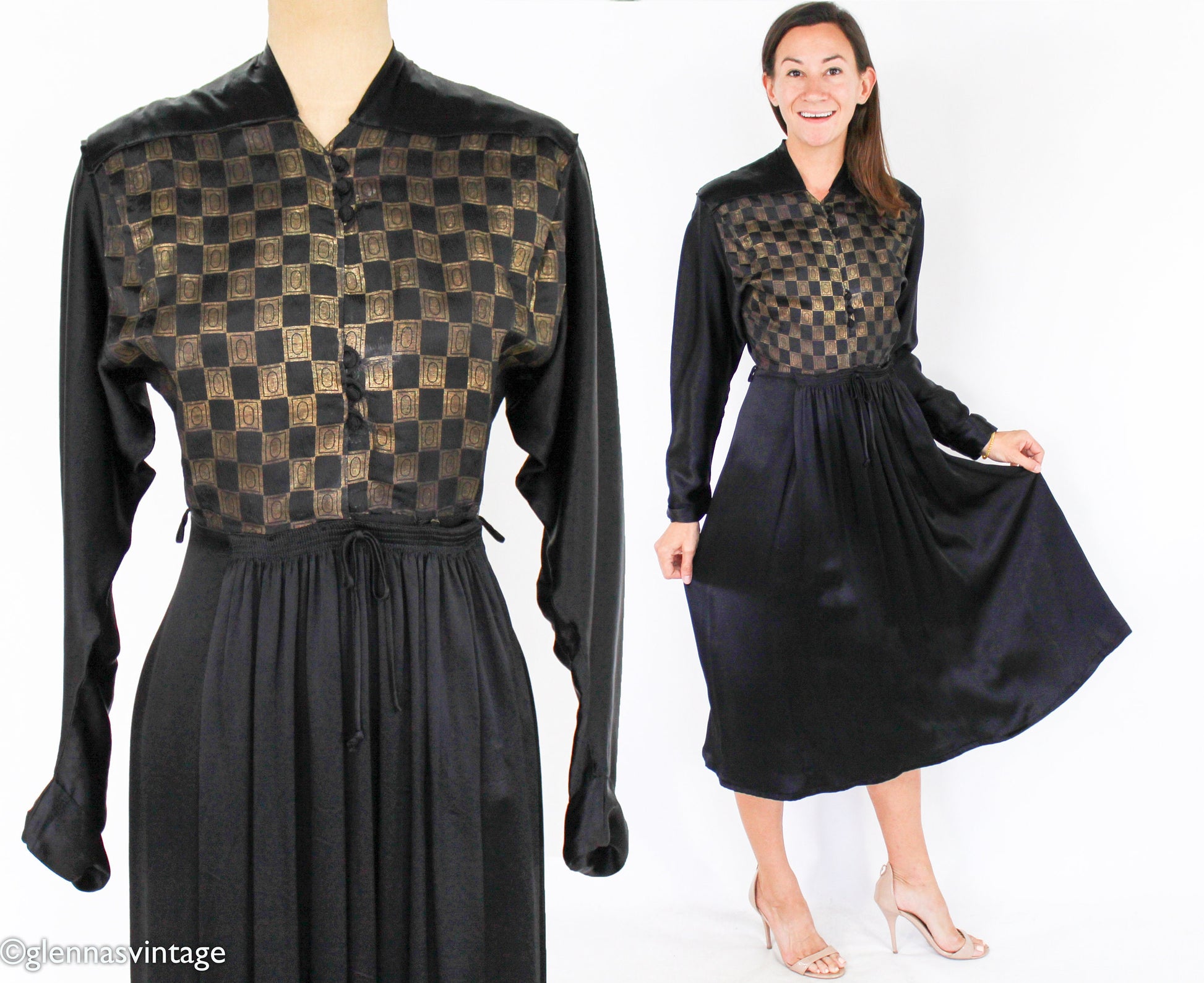 1940s Gold & Black Silk Dress | 40s Black Silk Embroidered Dress | Tula | Small