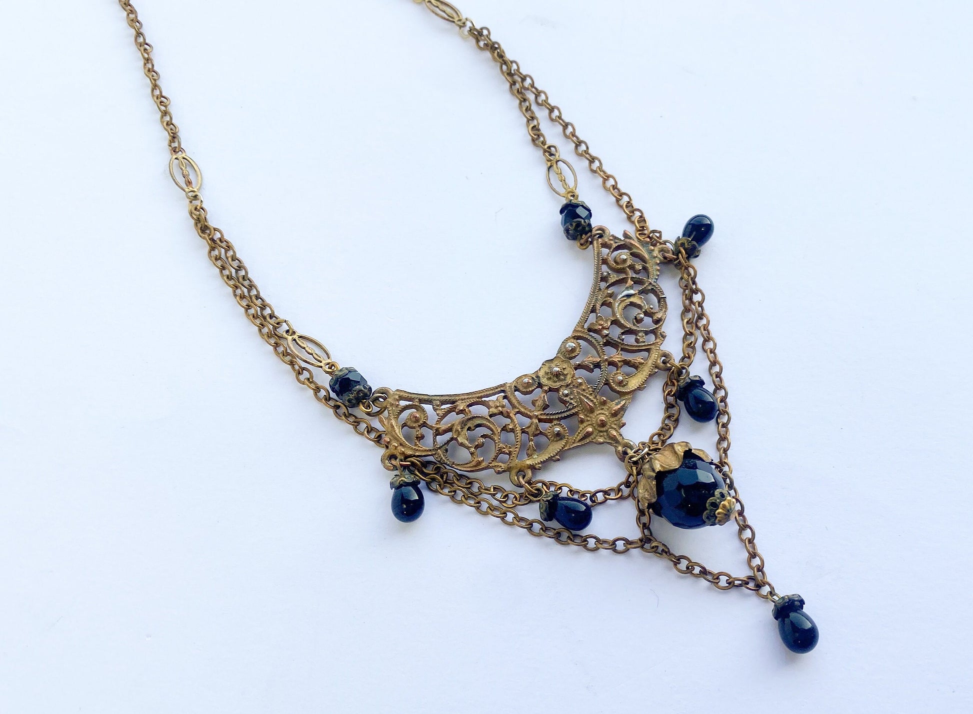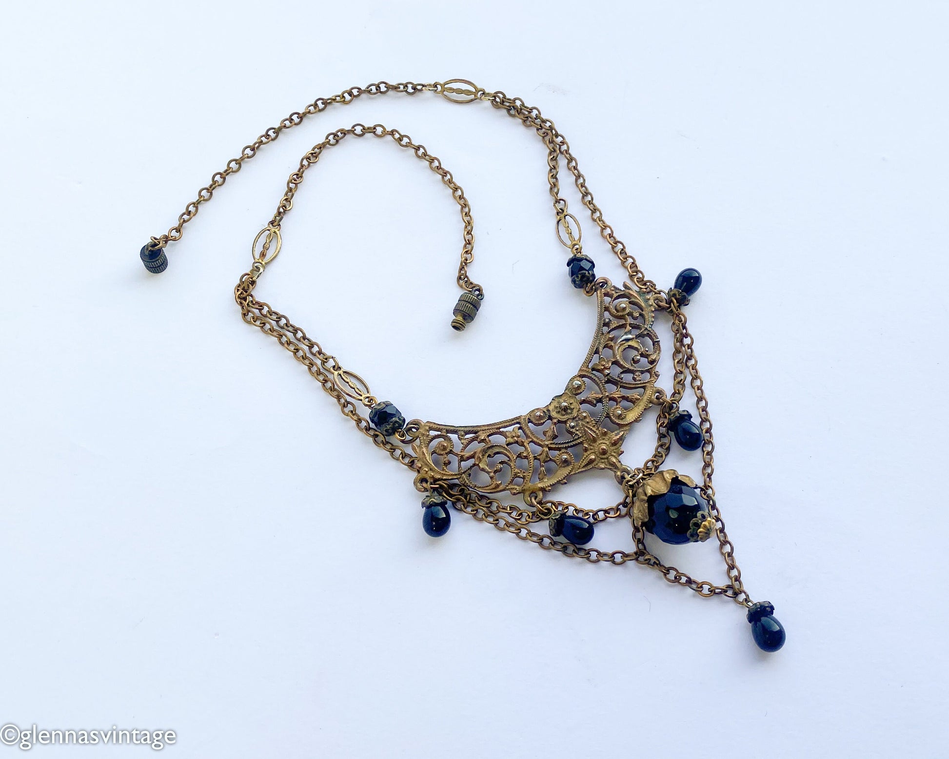 1940s Gold Filigree Brass Necklace | 40s Gold Filigree & Black Glass Pendant Necklace