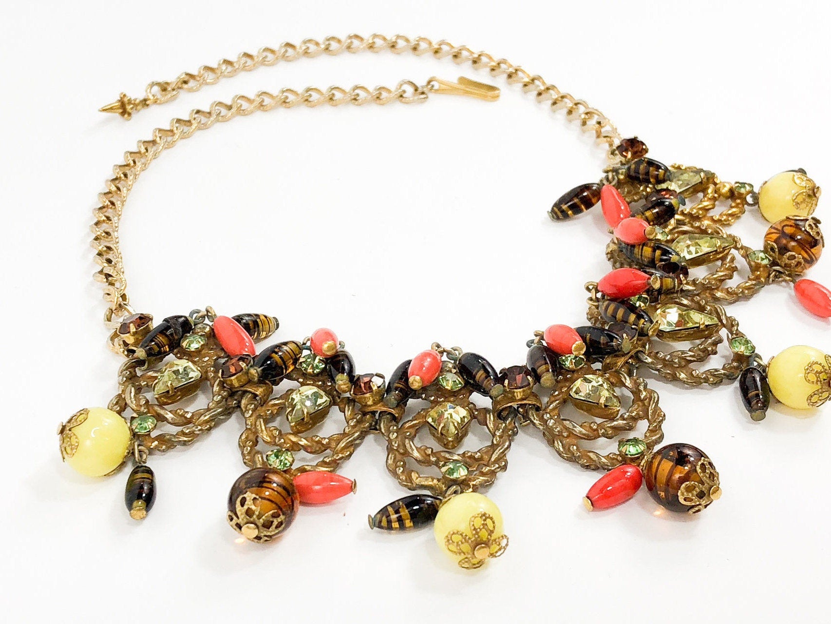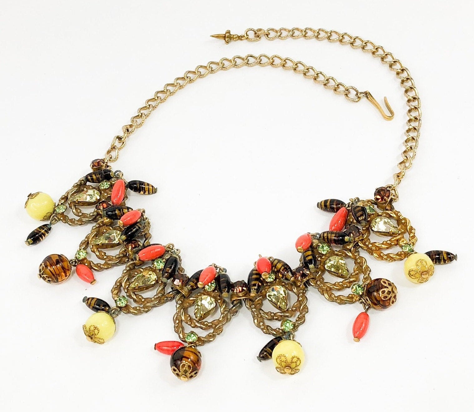 ~ 1940s my favorite beautiful unusual statement necklace ~ Unusual composition of Murano glass, beads, and rhinestones ~ 7 curved swirl gold metal segments & chain ~ Glass beads in yellow, orange, brown striped ~ Blue & green handset rhinestones ~ Clear teardrop rhinestones ~ Adjustable length ~ Excellent.... Shows some wear on back of gold metal only Adjustable Length- 16" to 20" (40.64 -50.8 cm) Width of Segments 2" (5..08 cm) More Fantastic Vintage Jewelry: glennasvintageshop.etsy.com Additional Vintage in our sister shop Glenna's Jewels: glennasjewels.etsy.com Instagram @glennas_clothing Facebook https://www.facebook.com/glennasclothing