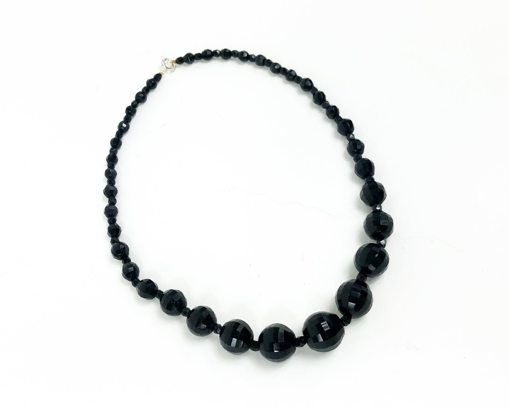 ~ 1950s Beautiful black faceted glass necklace ~ Single strand necklace of graduated sizes ~ Excellent Length- 16" (41 cm) Drop when held- 8" (20.32 cm) Additional Vintage Jewelry in our sister shop Glenna's Jewels: http://glennasjewels.etsy.com More Incredible Vintage: http://glennasvintageshop.etsy.com Instagram @glennas_clothing Facebook https://www.facebook.com/glennasclothing