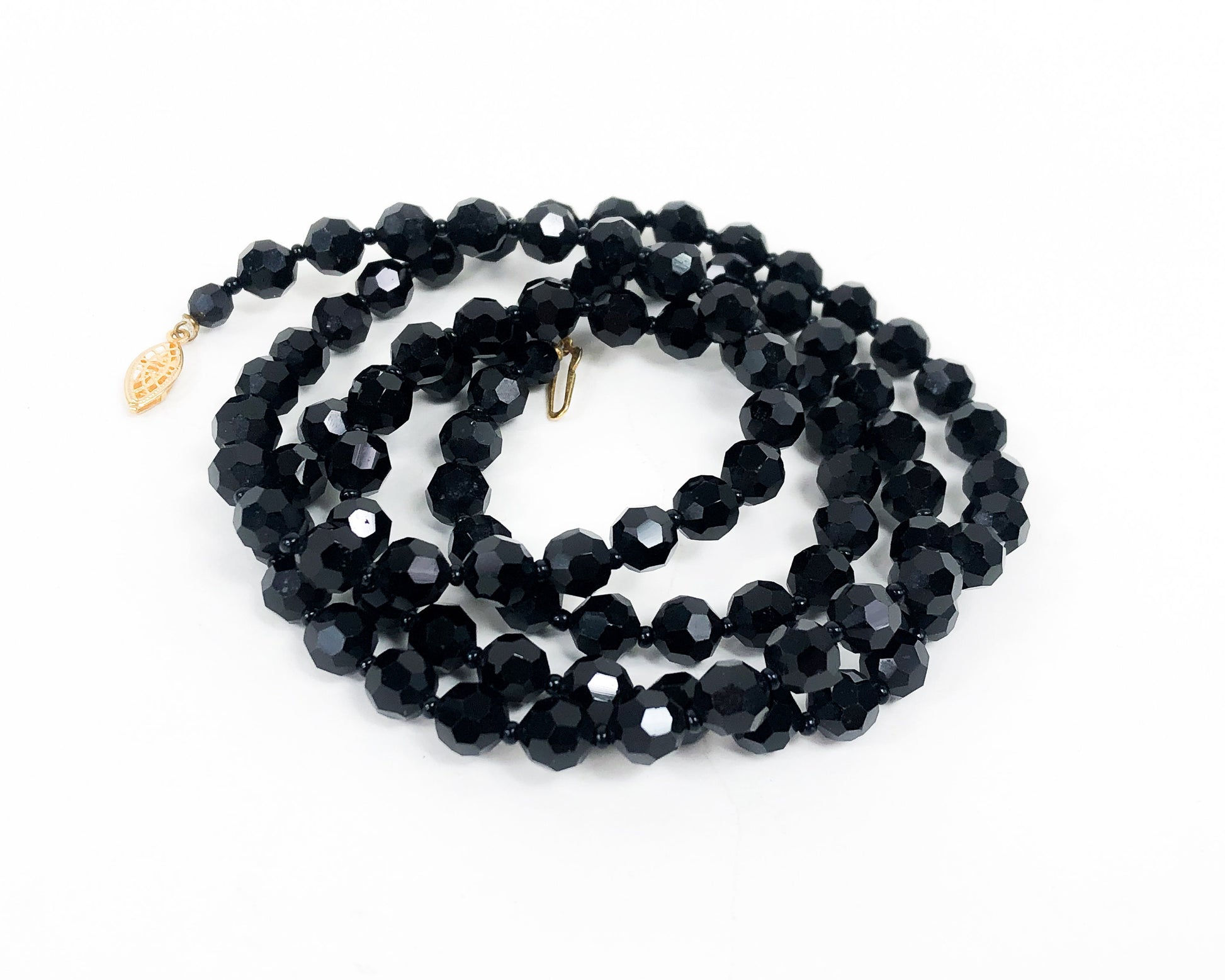 ~ 1950s beautiful black faceted glass bead necklace ~ Small black glass beads with tiny seed bead spacers ~ Single strand rope necklace ~ Gold clasp ~ Excellent Length- 36" (91.5 cm) Drop when held- 18" (45.72 cm) Additional Vintage Jewelry in our sister shop Glenna's Jewels: http://glennasjewels.etsy.com More Incredible Vintage: http://glennasvintageshop.etsy.com Instagram @glennas_clothing Facebook https://www.facebook.com/glennasclothing