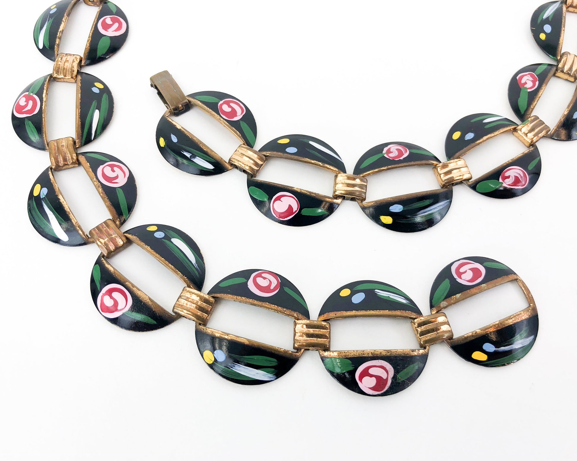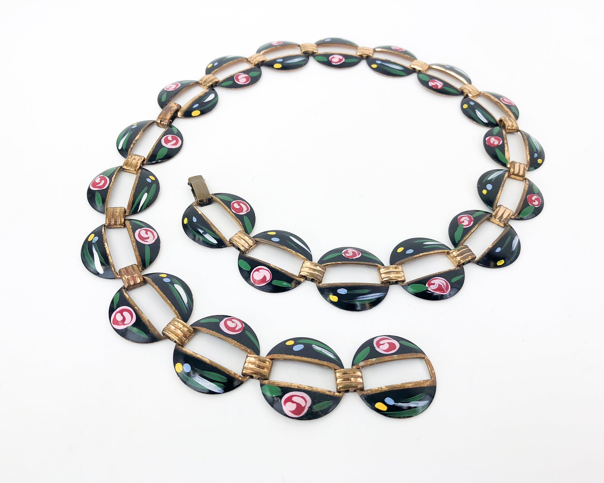 ~ 1950s lovely black enamel & copper circles necklace ~ Painted with dainty pink enamel flowers ~ Very nice Length- 22" (55.88 cm) Width- 1" (2.54 cm) Additional Vintage Jewelry in our sister shop Glenna's Jewels: http://glennasjewels.etsy.com More Incredible Vintage: http://glennasvintageshop.etsy.com Instagram @glennas_clothing Facebook https://www.facebook.com/glennasclothing