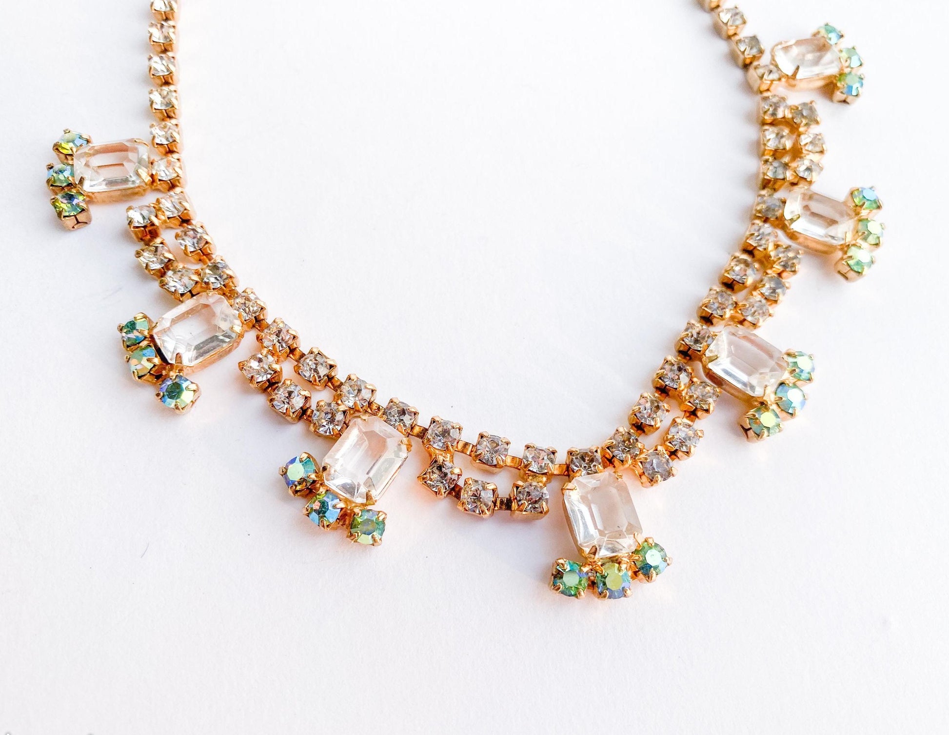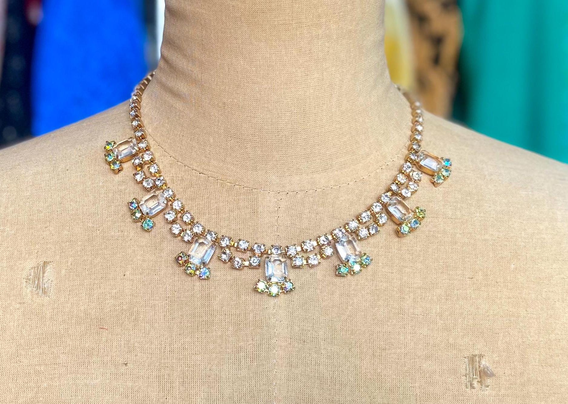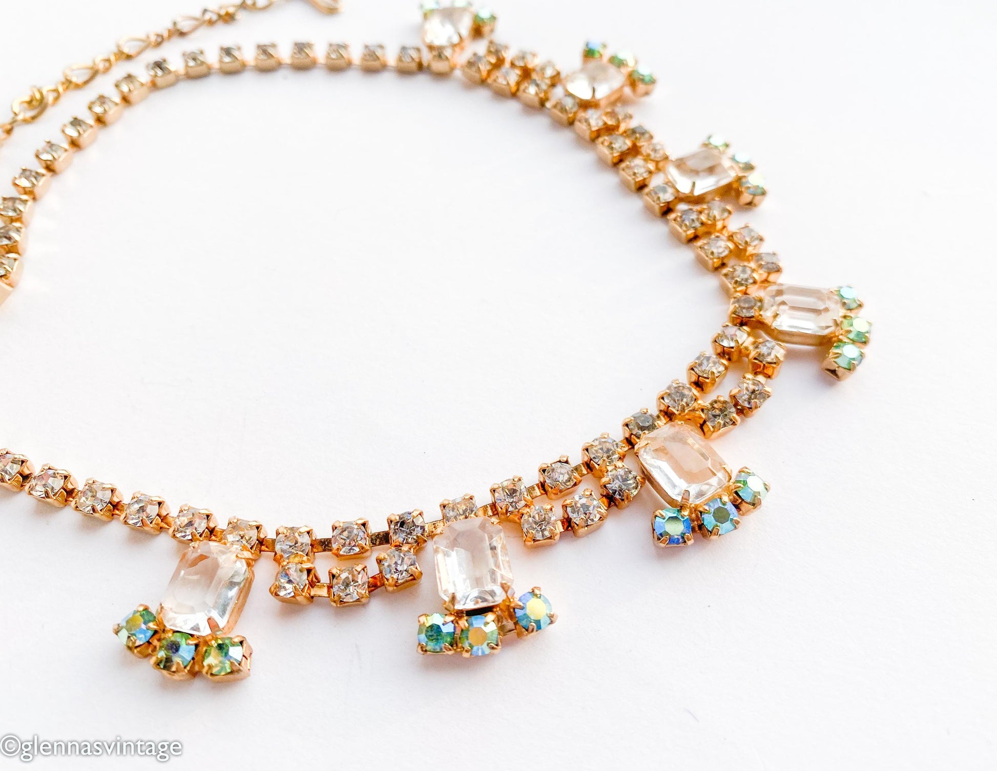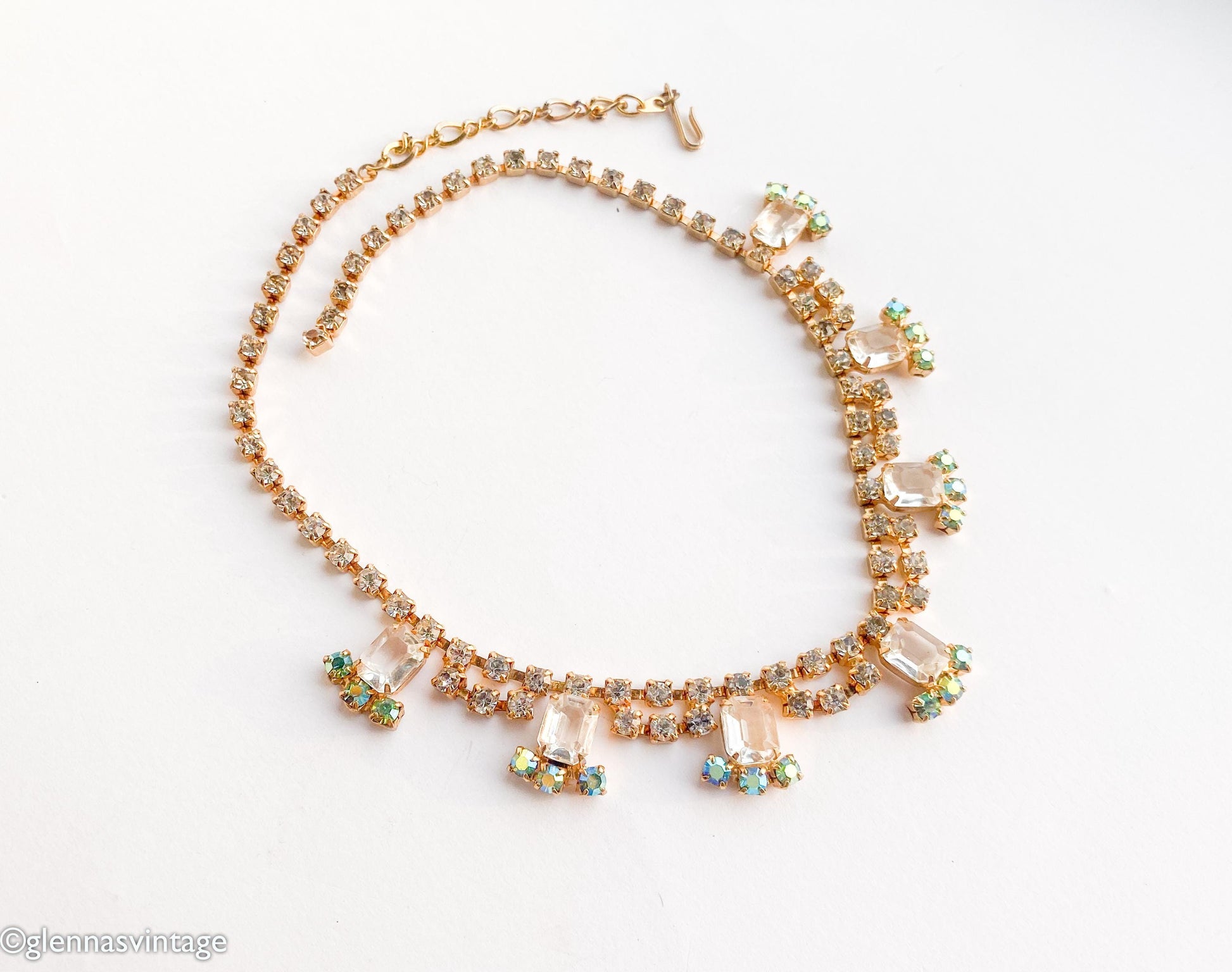 ~ 1950s gold rhinestone necklace ~ Clear glass rectangles ~ Aurora borealis rhinestones ~ All handset rhinestones ~ Adjustable length ~ Lovely gold metal ~ Excellent condition Length- 17" (43 cm) Width- .75” (1.90 cm) More Fantastic Vintage Jewelry: glennasvintageshop.etsy.com Additional Vintage in our sister shop Glenna's Jewels: glennasjewels.etsy.com Instagram @glennas_clothing Facebook https://www.facebook.com/glennasclothing