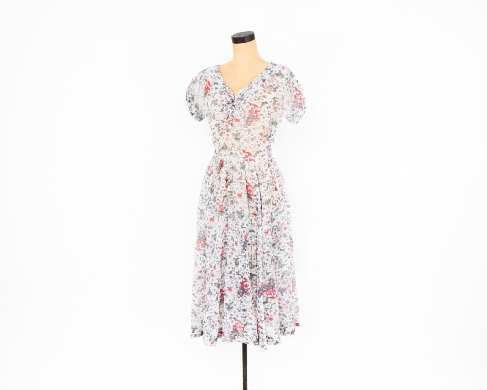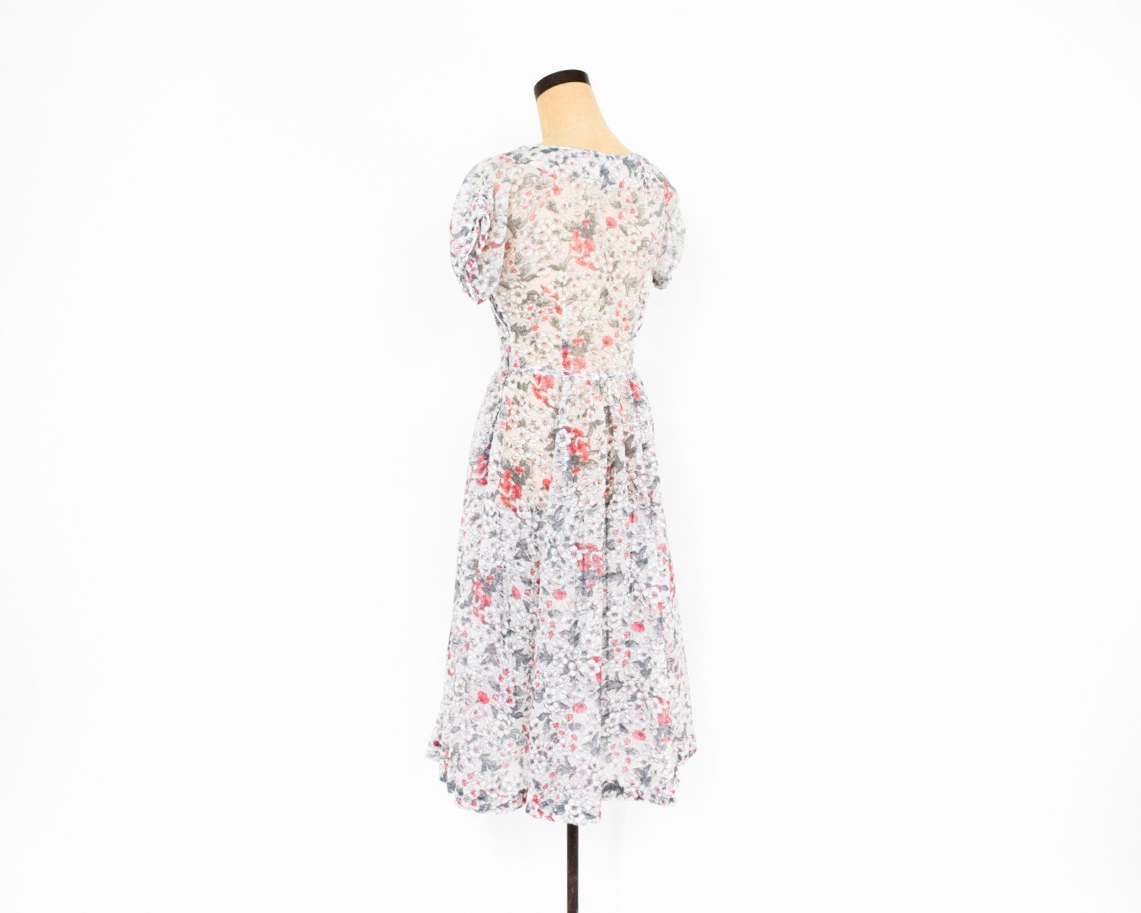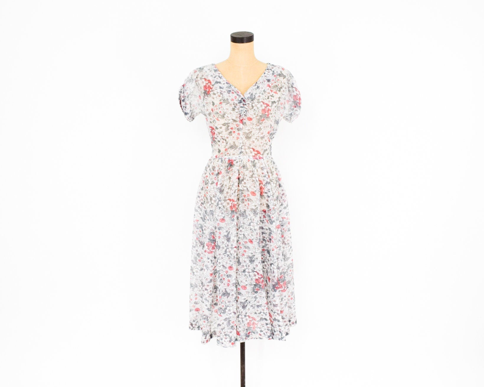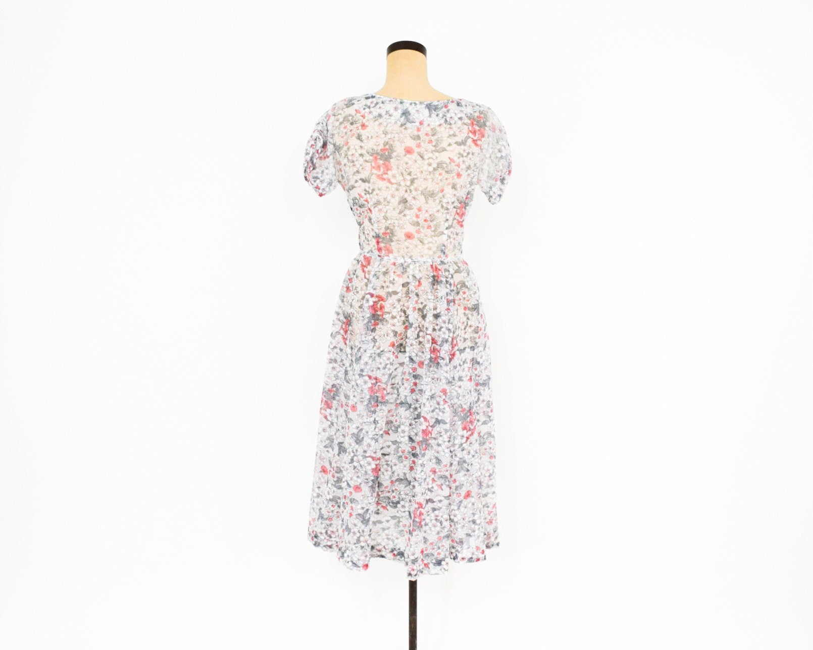~ 1950s sheer white nylon floral day dress ~ White with gray & red floral print ~ Side metal zipper ~ Gathered short sleeves ~ 3 tiny bows in the front ~ Midcentury, new look ~ Excellent Bust- 36" (91.5 cm) Waist- 26" (66 cm) Hips- 46" (117 cm) Length- 44" (112 cm) Sleeve- 4" (10 cm) More Incredible Vintage: glennasvintageshop.etsy.com Vintage Jewelry: glennasjewels.etsy.com Instagram @glennas_clothing Facebook https://www.facebook.com/glennasclothing