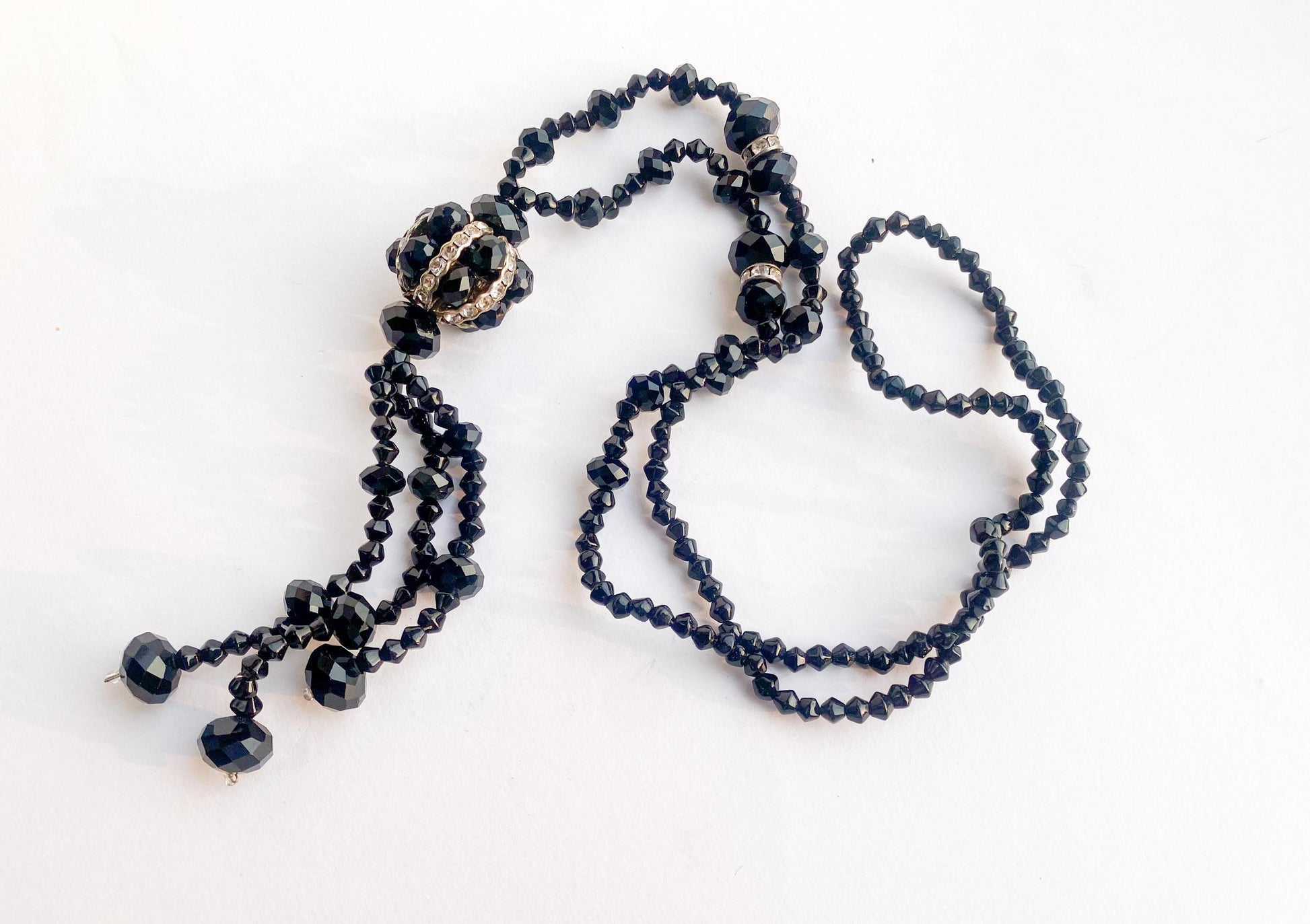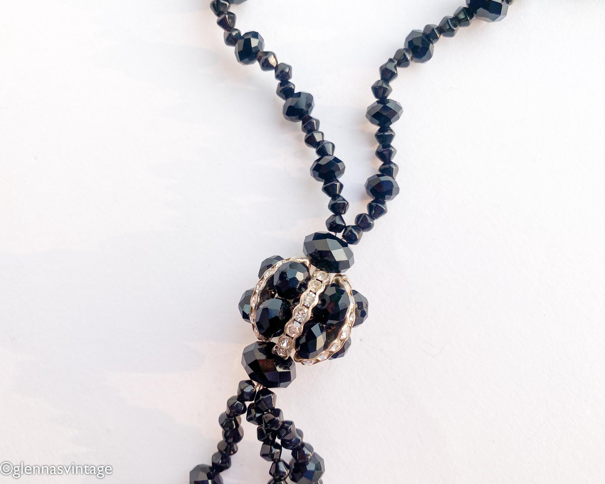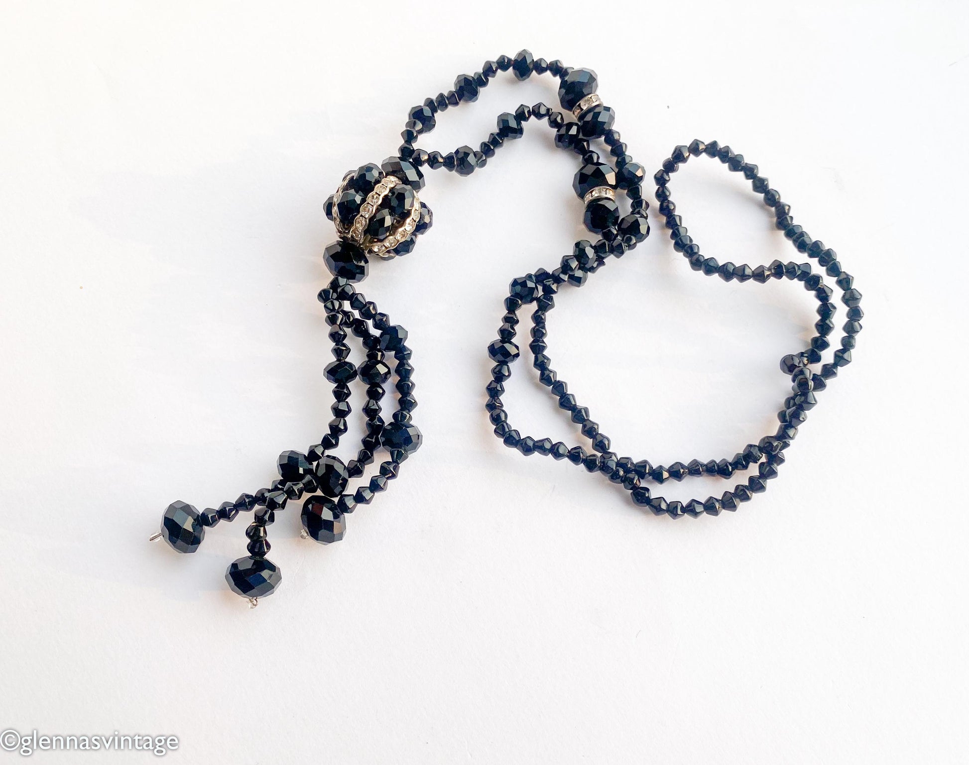 ~ 1960s long black faceted glass pendant necklace ~ Black glass beads & rhinestone pendant drop with 3 fringe beaded strands ~ Rope necklace of black glass faceted beads ~ Rhinestones ~ No clasp ~ Very nice Length- 18" (46 cm) Total pendant drop- 5” (12.7 cm) More Fantastic Vintage Jewelry: glennasvintageshop.etsy.com More grand finds at Glenna's Jewels: glennasjewels.etsy.com Instagram @glennas_clothing Facebook https://www.facebook.com/glennasclothing