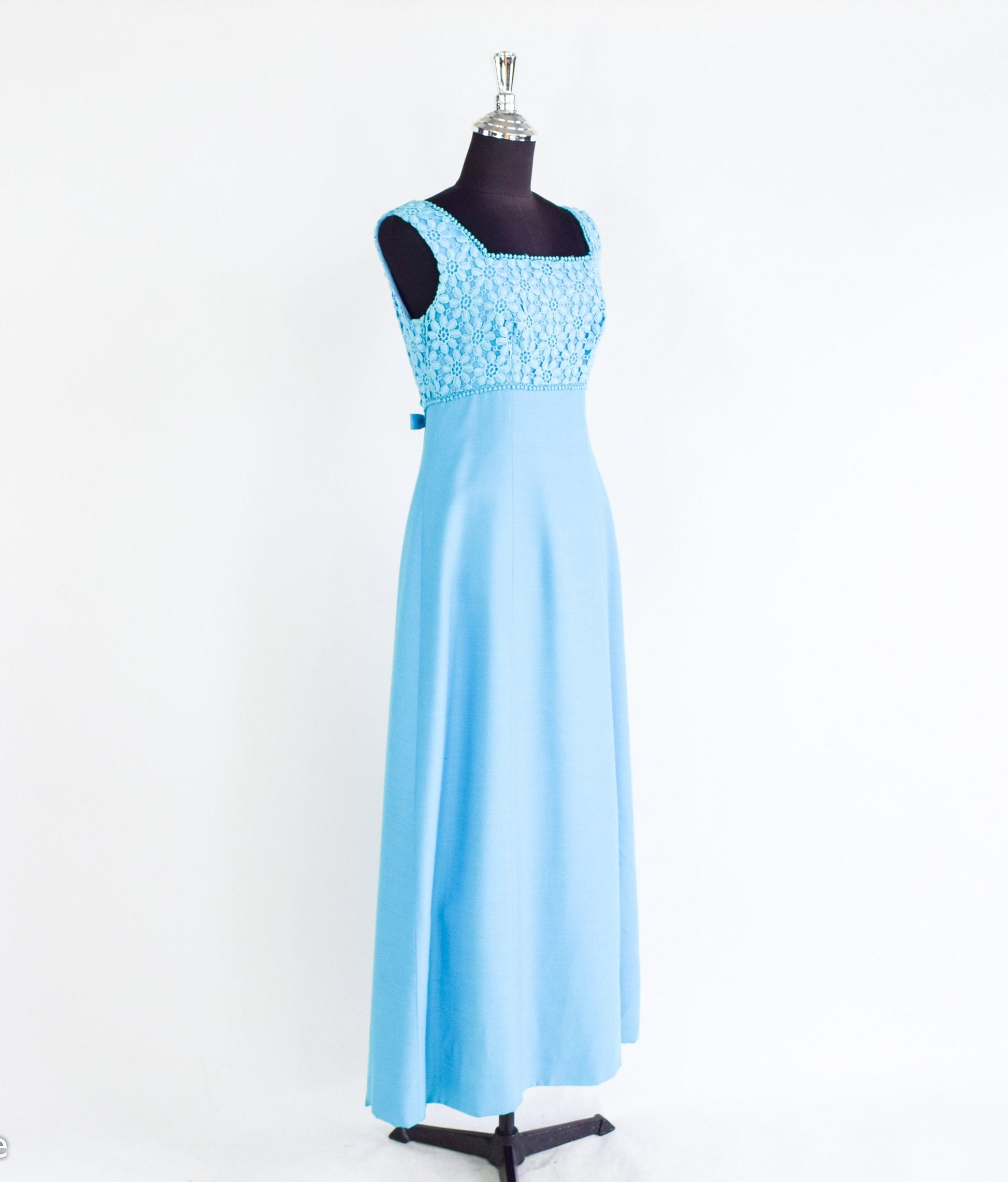 ~ 1960s peacock blue lace top evening dress ~ Sleeveless Maxi dress ~ Cotton daisy lace flower top prom dress ~ Long floor length lined back panel to hide closure and add drama ~ 2 small bows and snaps ~ Back metal zipper 14" (35.56 cm) ~ Taffeta lining ~ Excellent Bust- 34" (86.36 cm) Shoulders- 15" (38.1 cm) Mid drift - 28" (71.12 cm) Hips- 38" (96.52 cm) Length- 58" (147.32 cm) More Incredible Vintage: glennasvintageshop.etsy.com Vintage Jewelry: glennasjewels.etsy.com Instagram @glennas_clothing Facebook https://www.facebook.com/glennasclothing