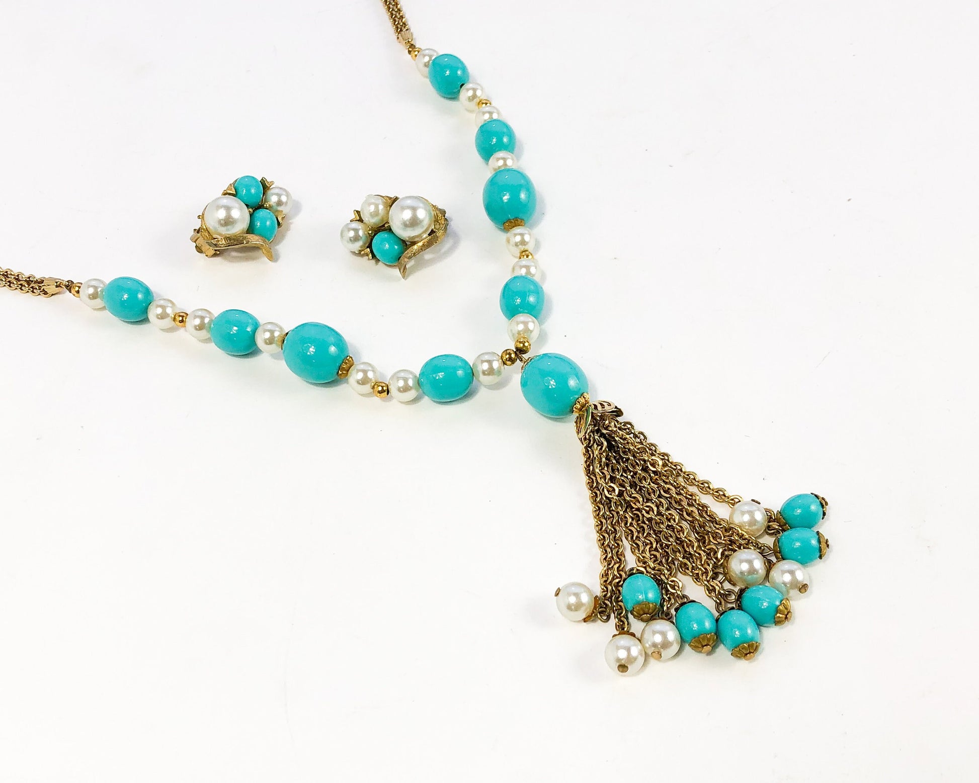 1960s Turquoise Pendant Necklace & Earrings | 60s Gold Turquoise Faux Pearl Necklace Set