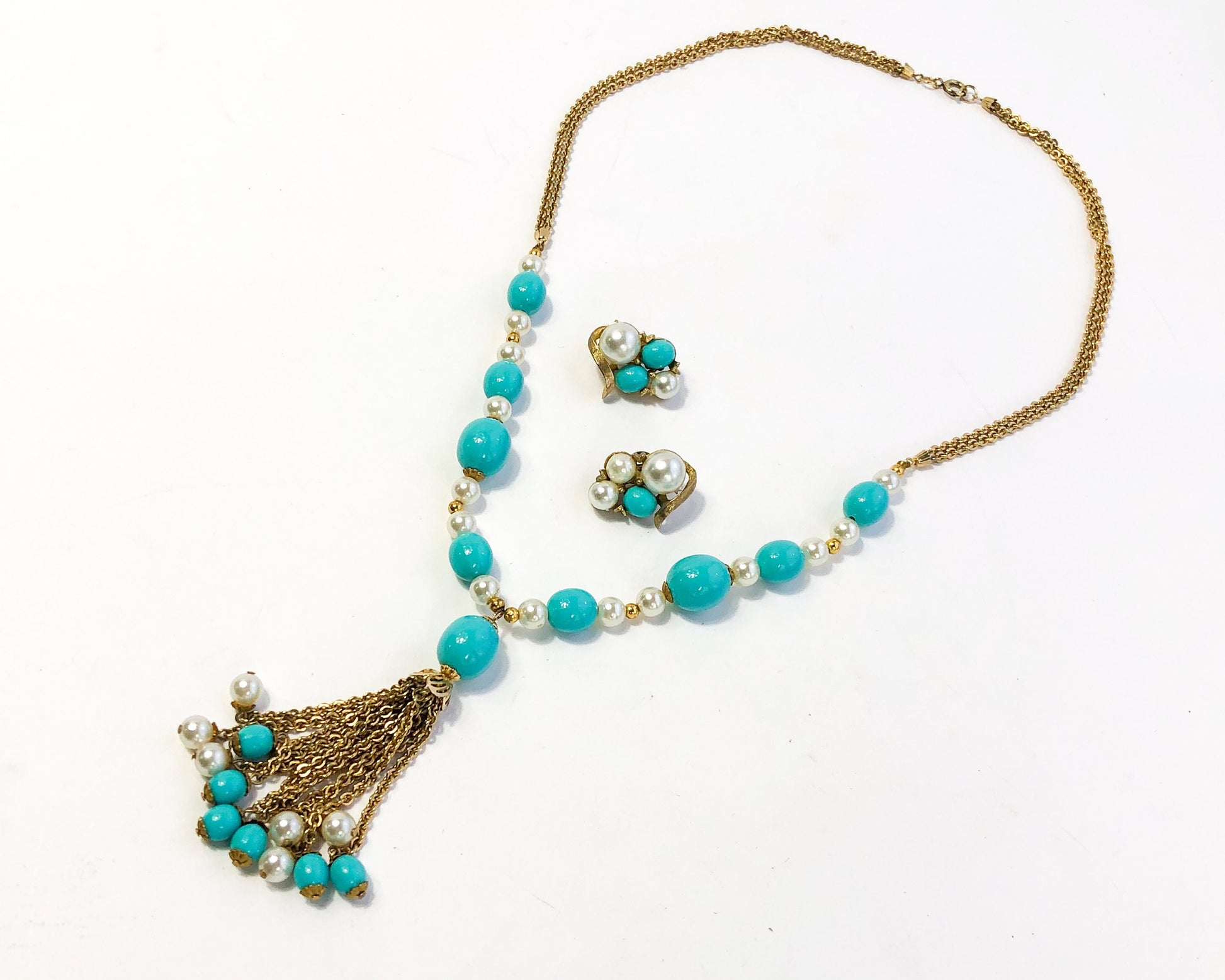 ~ 1960s turquoise plastic & faux pearls set ~ Gold chains necklace set ~ Pendant style necklace ~ Matching clip earrings ~ Excellent Length- 17" (43.18 cm) Earrings- 1" (2.54 cm) More Fantastic Vintage Jewelry: glennasvintageshop.etsy.com Additional Vintage in our sister shop Glenna's Jewels: glennasjewels.etsy.com Instagram @glennas_clothing Facebook https://www.facebook.com/glennasclothing