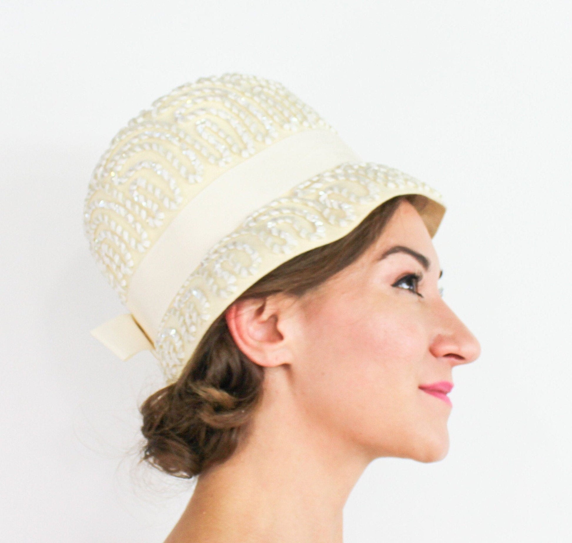 ~ 1960s white or creme wool felt bucket hat ~ Sequins & ribbon swirls cover entire hat ~ Grosgrain ribbon hat band & flat bow ~ Wide narrow brim 2" (5 cm) ~ Union label ~ Excellent Width- 8.5" (21.5 cm) Height- 7" (18 cm) Inner band- 21" (53.5 cm) More Incredible Vintage: http://glennasvintageshop.etsy.com Vintage Jewelry: http://glennasjewels.etsy.com Instagram @glennas_clothing Facebook https://www.facebook.com/glennasclothing