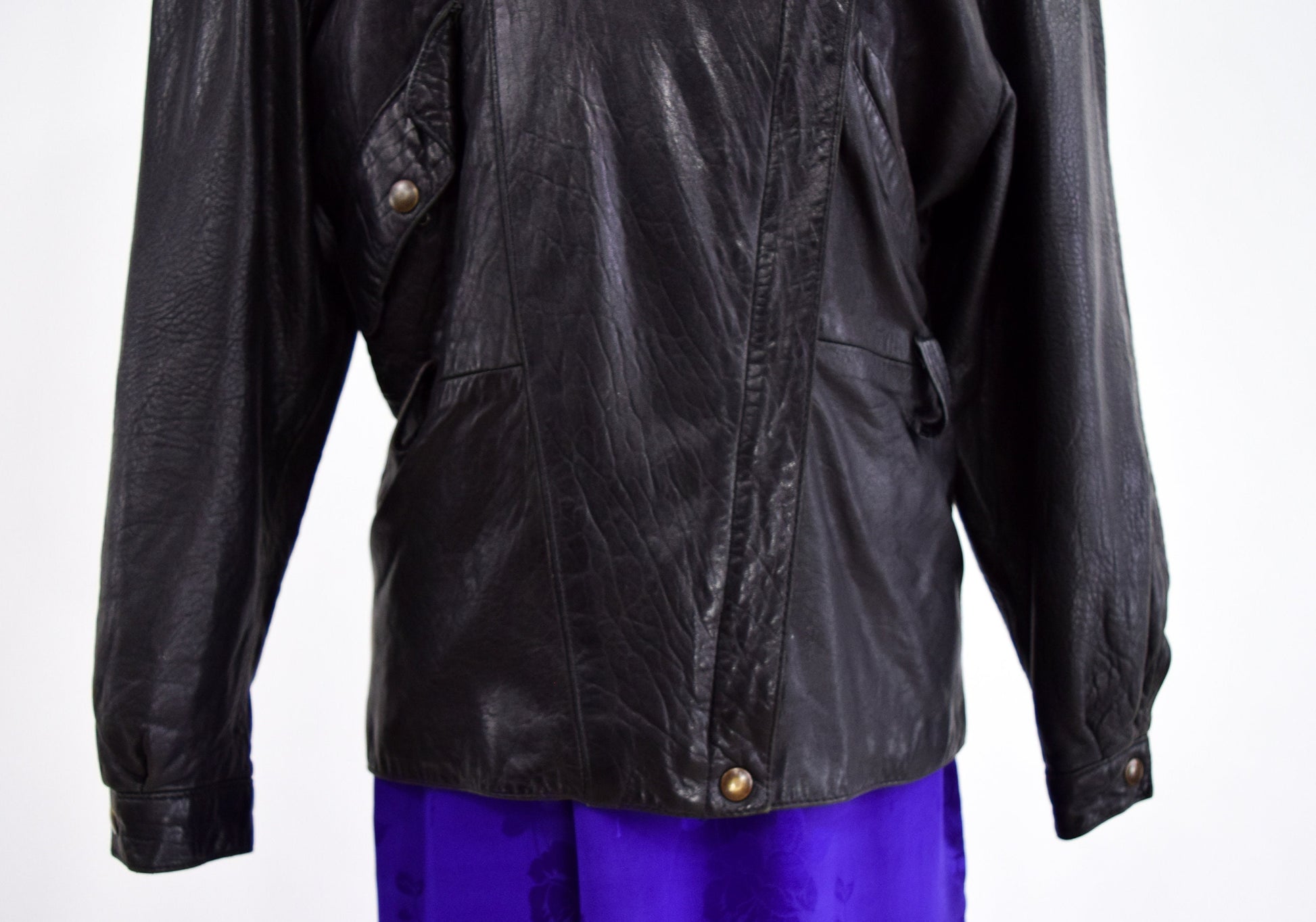 ~ 1980s black leather belted jacket ~ Great moto/biker style ~ Padded sleeves ~ Wing collar ~ 2 front slant pockets, 1 with flap ~ Metal asymmetrical metal zipper closure 18.5” (46.99 cm) ~ Long adjustable matching belt which was not shown 58" (147.32 cm) ~ 5 brass tone snaps ~ Wonderful textured soft leather ~ Fully lined in black rayon ~ Excellent Label: Melanzona Made in USA Bust- 42” (106.68 cm) Shoulder- 19” (48.26 cm) Waist- 36” (91.44 cm) Sleeve- 23.5” (59.69 cm) Length- 25” (63.5 cm) More Incredible Vintage: glennasvintageshop.etsy.com Vintage Jewelry: glennasjewels.etsy.com Instagram @glennas_clothing Facebook https://www.facebook.com/glennasclothing