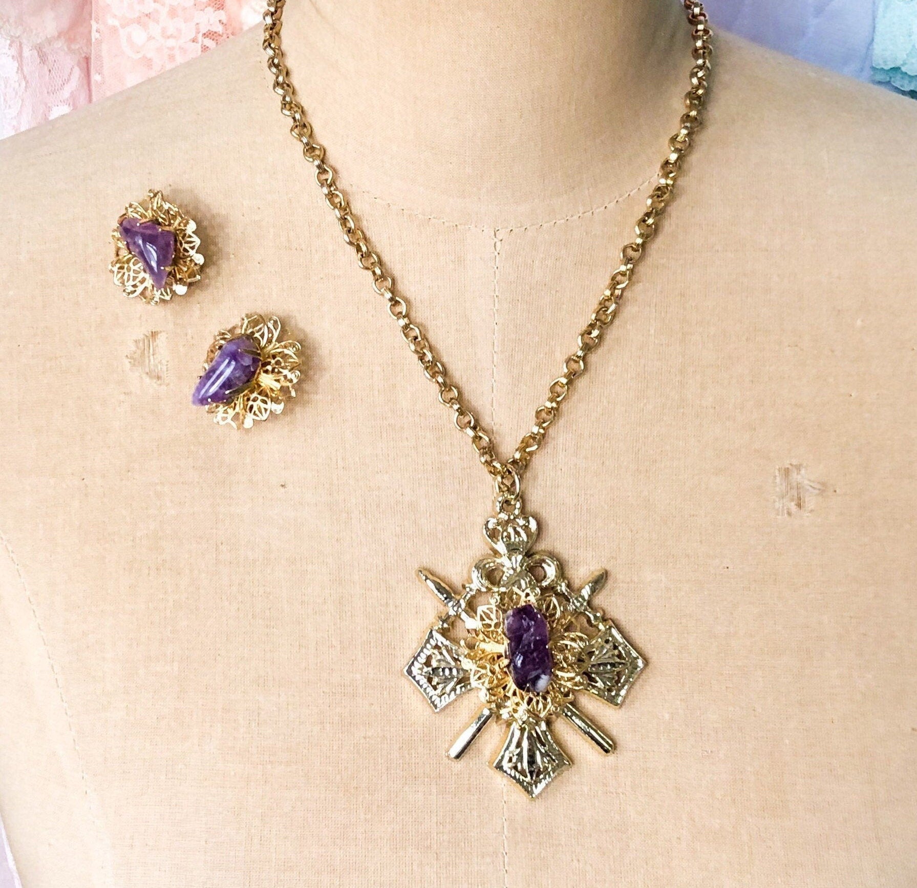 ~ 1970s gold & purple pendant necklace set ~ Lavender agate stones ~ Matching clip earrings ~ Excellent Mark: Coro Necklace- 21.5" (54.61cm) Earrings- 1" (2.54 cm) Pendant- 2.5 x 2" (6.36 cm x 5.08 cm) More Fantastic Vintage Jewelry: glennasvintageshop.etsy.com Additional Vintage in our sister shop Glenna's Jewels: glennasjewels.etsy.com Instagram @glennas_clothing Facebook https://www.facebook.com/glennasclothing