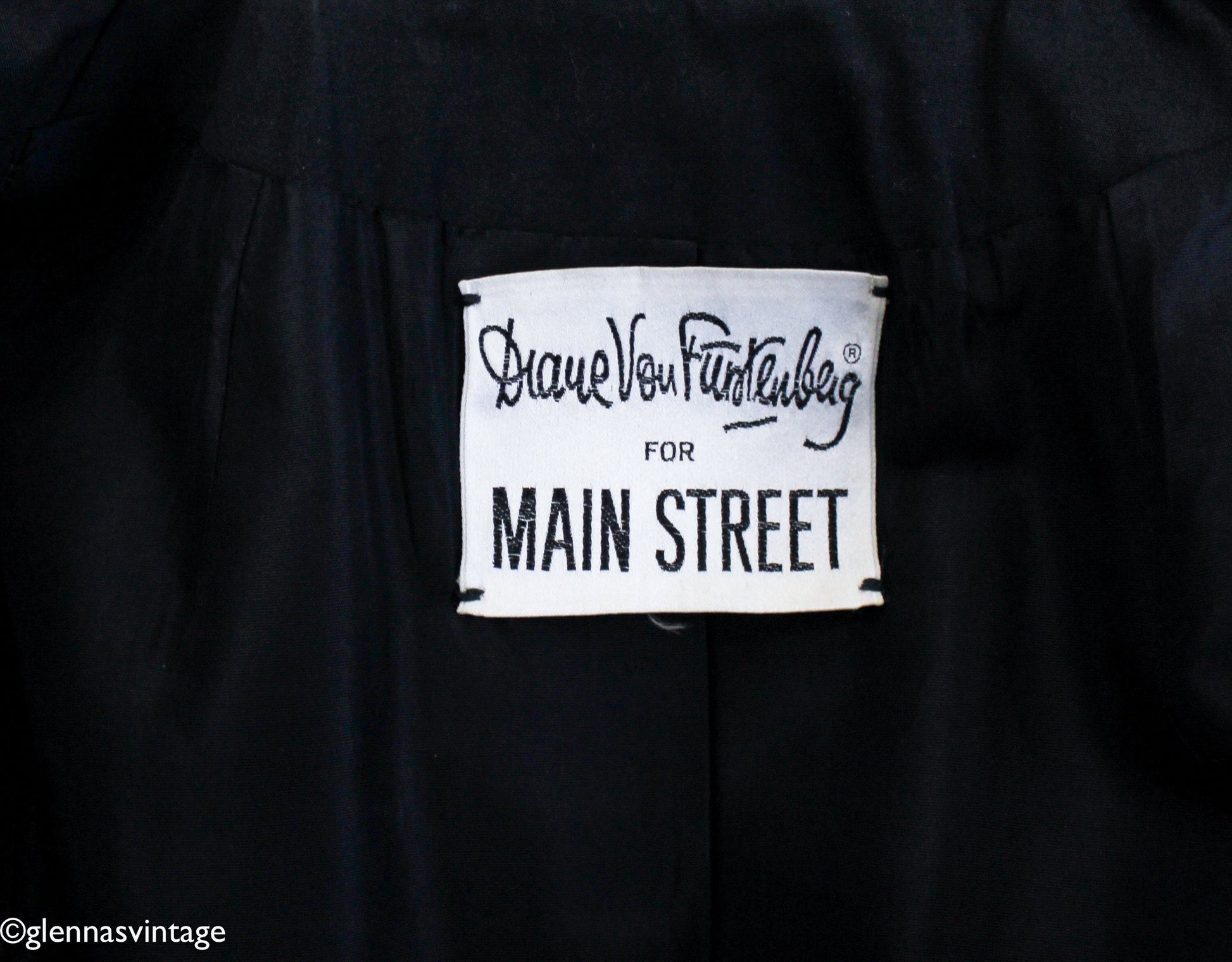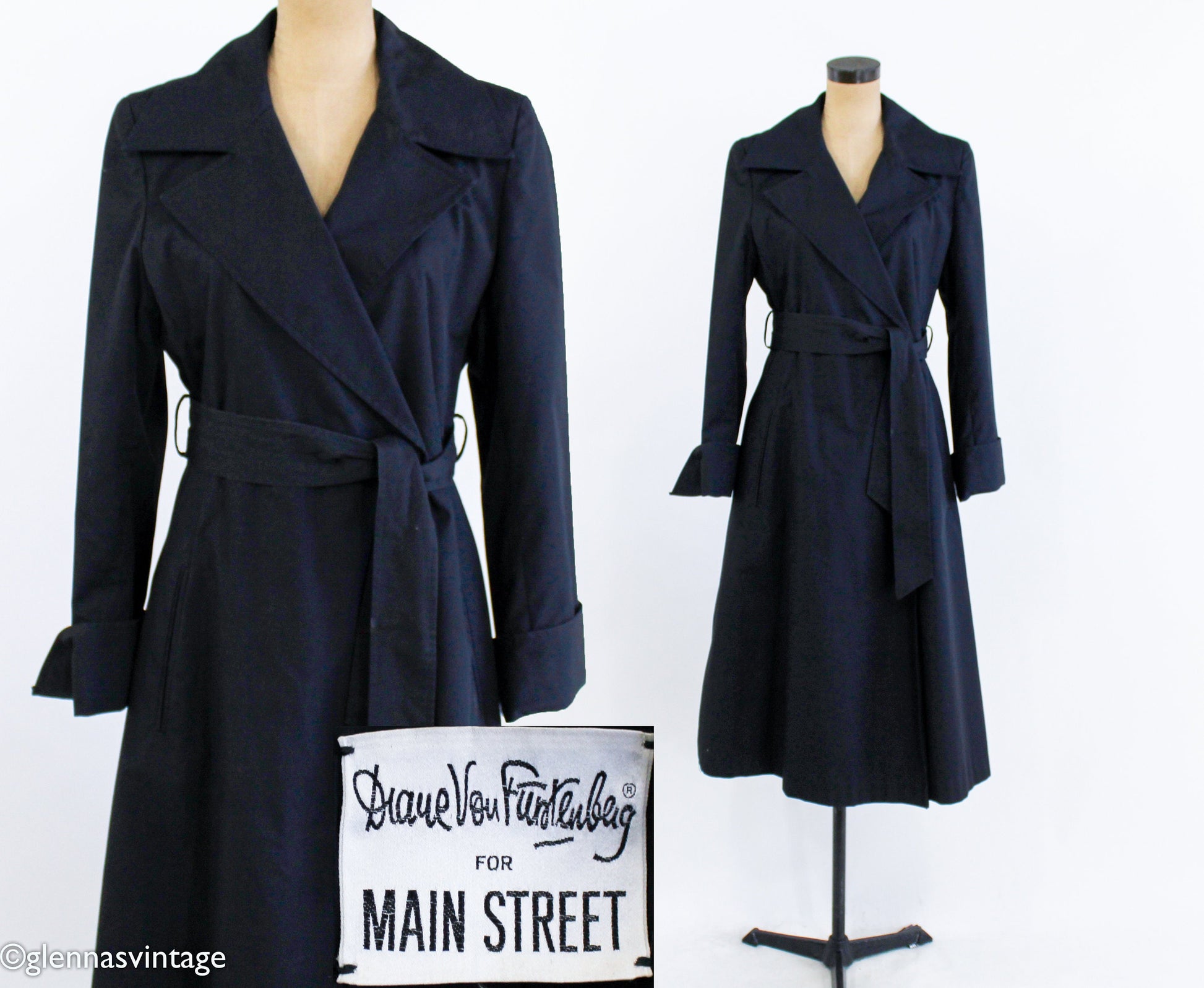 ~ 1980s black cotton long trench coat ~ Heavy quality cotton ~ Long sleeves have turned up cuffs ~ Notched collar ~ Front has 2 exterior buttons ~ Self fabric ties with loops 62" ~ Pocket on each side ~ Flare skirt wrap coat ~ Fully lined in taffeta ~ Dry clean ~ Excellent Label: Diane Von Furstenberg for Main Street Bust- 36” (91.4 cm) Shoulder- 16.5” (41.91 cm) Un-cuffed sleeve- 26” (66.04 cm) Waist- 32.5” (82.55 cm) Hip- 47” (199.38 cm) Length- 49” (124.46 cm) More Incredible Vintage: glennasvintageshop.etsy.com Vintage Jewelry: glennasjewels.etsy.com Instagram @glennas_clothing Facebook https://www.facebook.com/glennasclothing