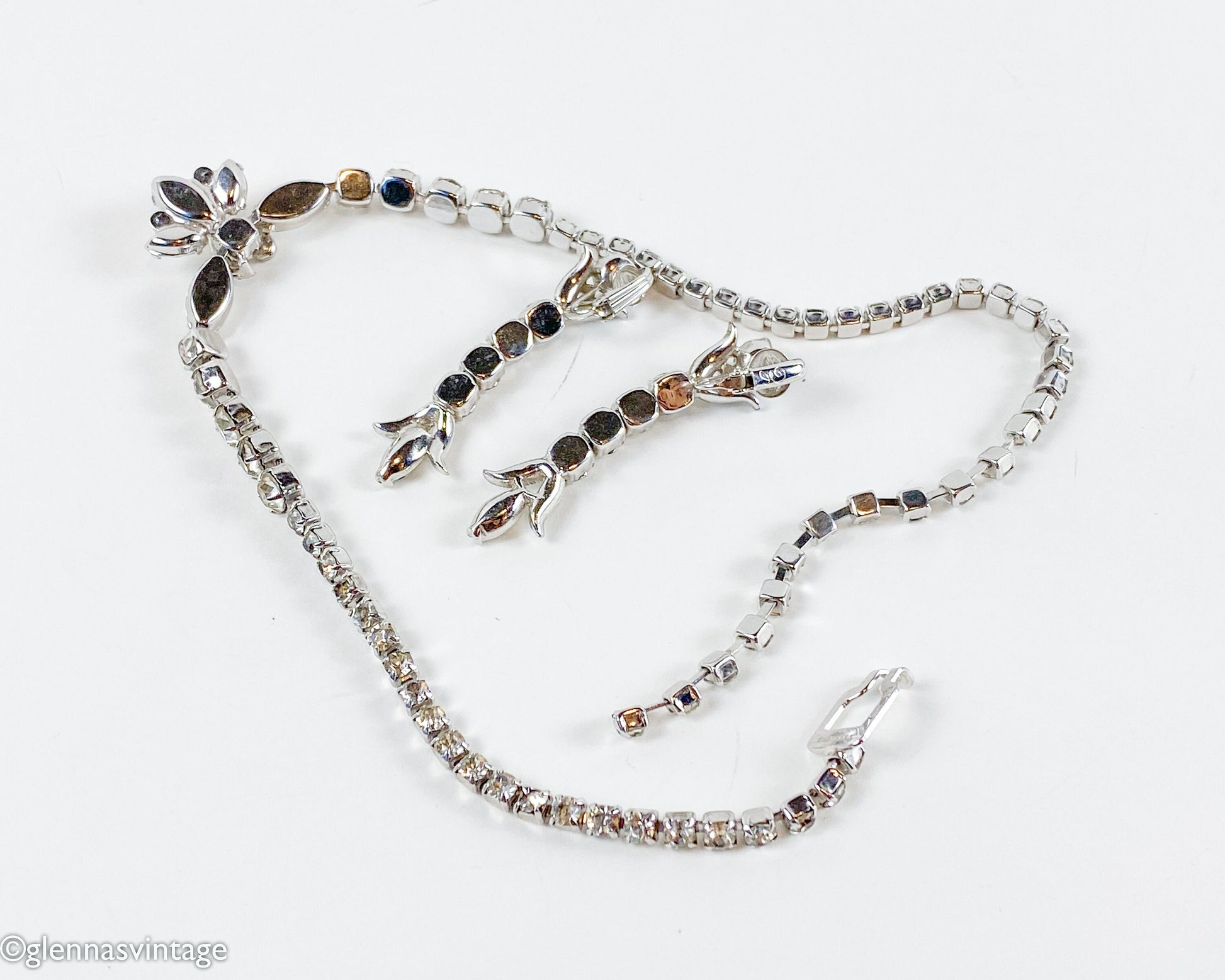 ~ 1950s Eisenberg pendant necklace and matching earrings set ~ Adjustable length necklace and clip drop earrings ~ Beautiful wedding & evening jewelry ~ Handset rhinestones ~ Can see some of the photographers reflection.... ~ This is a brilliant set and all stones complete ~ Excellent Mark: Eisenberg E Necklace- 17" (43 cm) Pendant Length- 1" (2.5 cm) Earrings- 2.25" (5.5 cm) More Fantastic Vintage Jewelry: glennasvintageshop.etsy.com More grand finds at Glenna's Jewels: glennasjewels.etsy.com Instagram @glennas_clothing Facebook https://www.facebook.com/glennasclothing