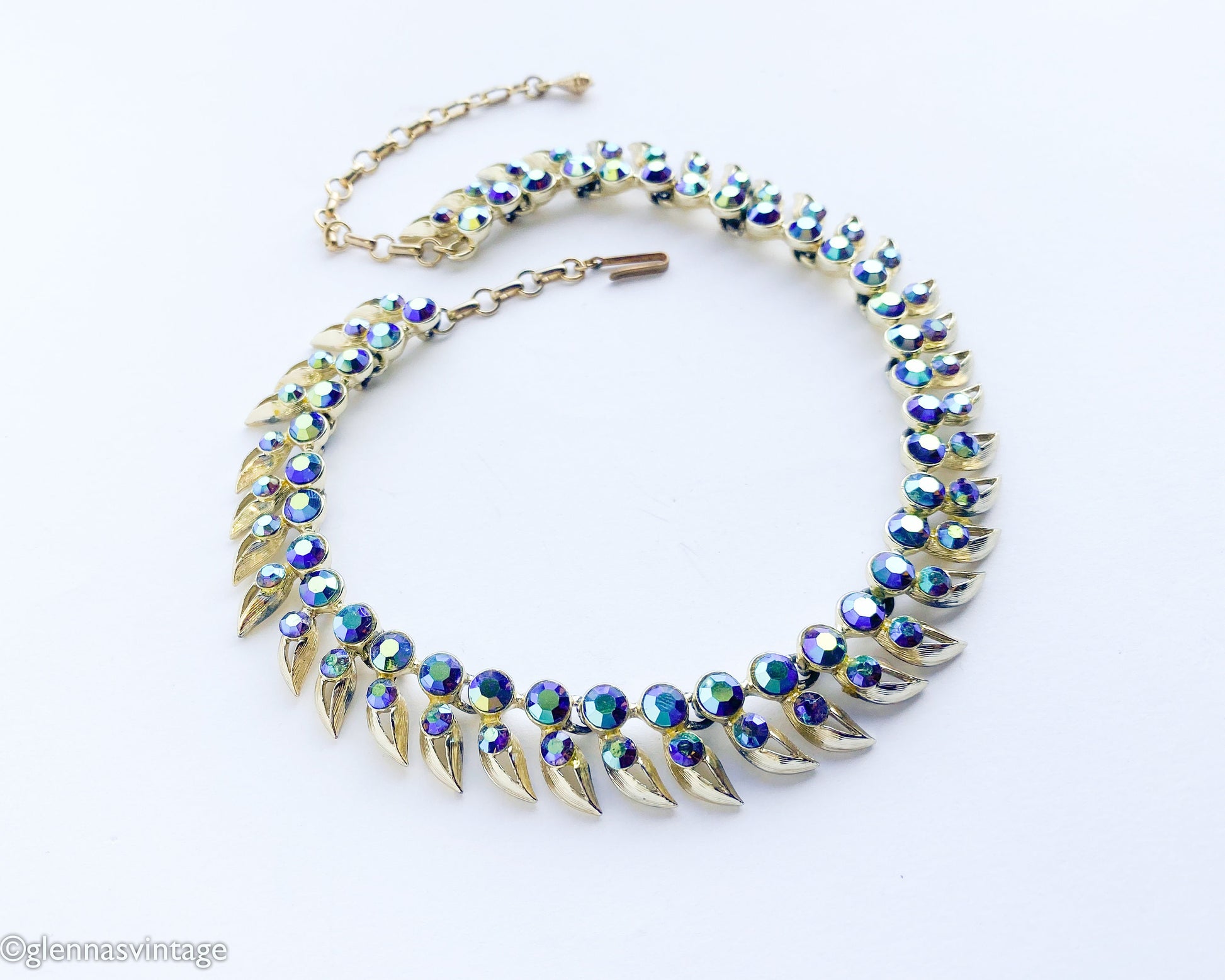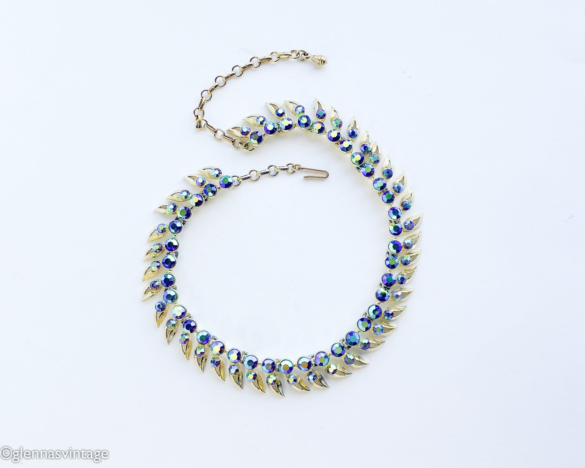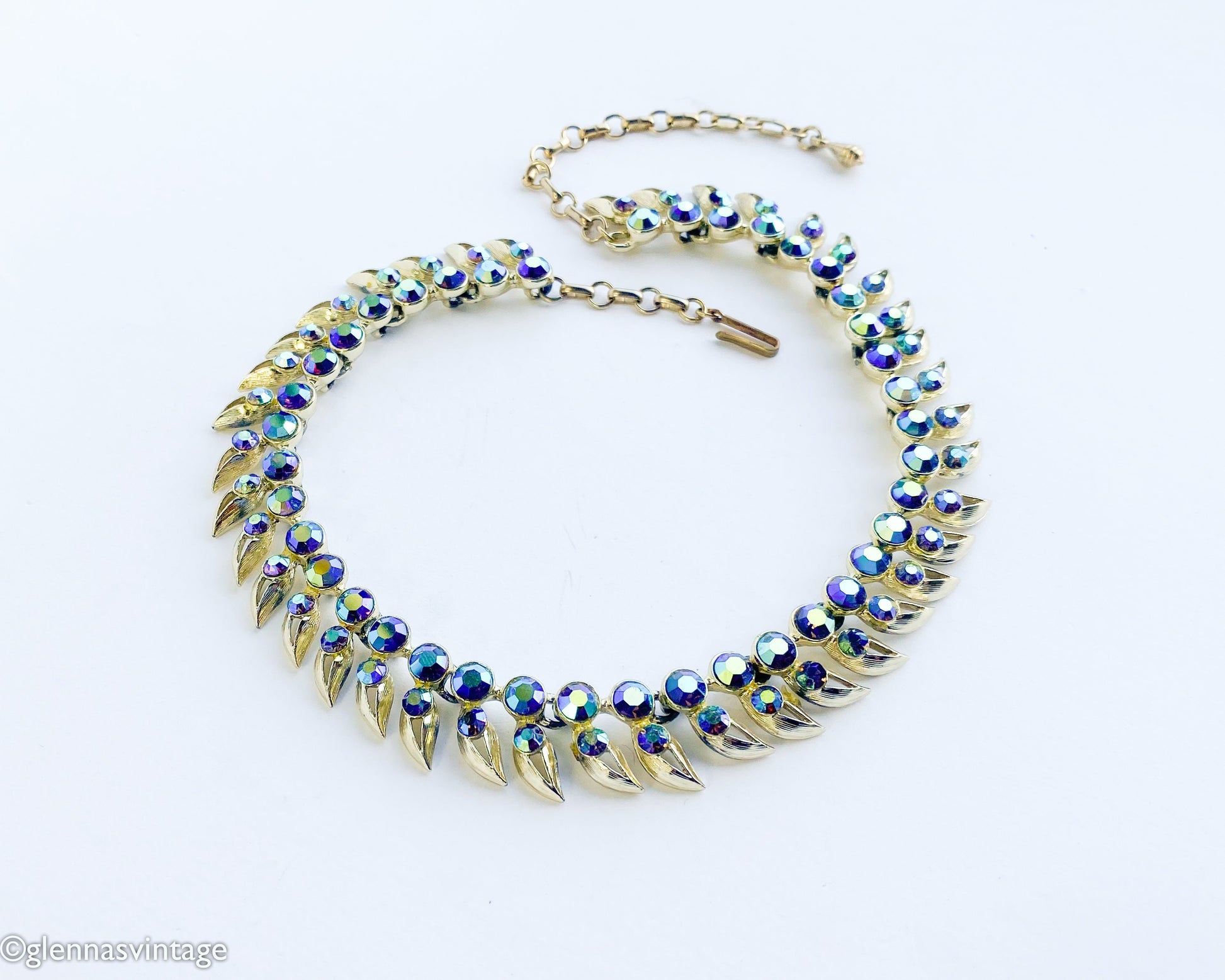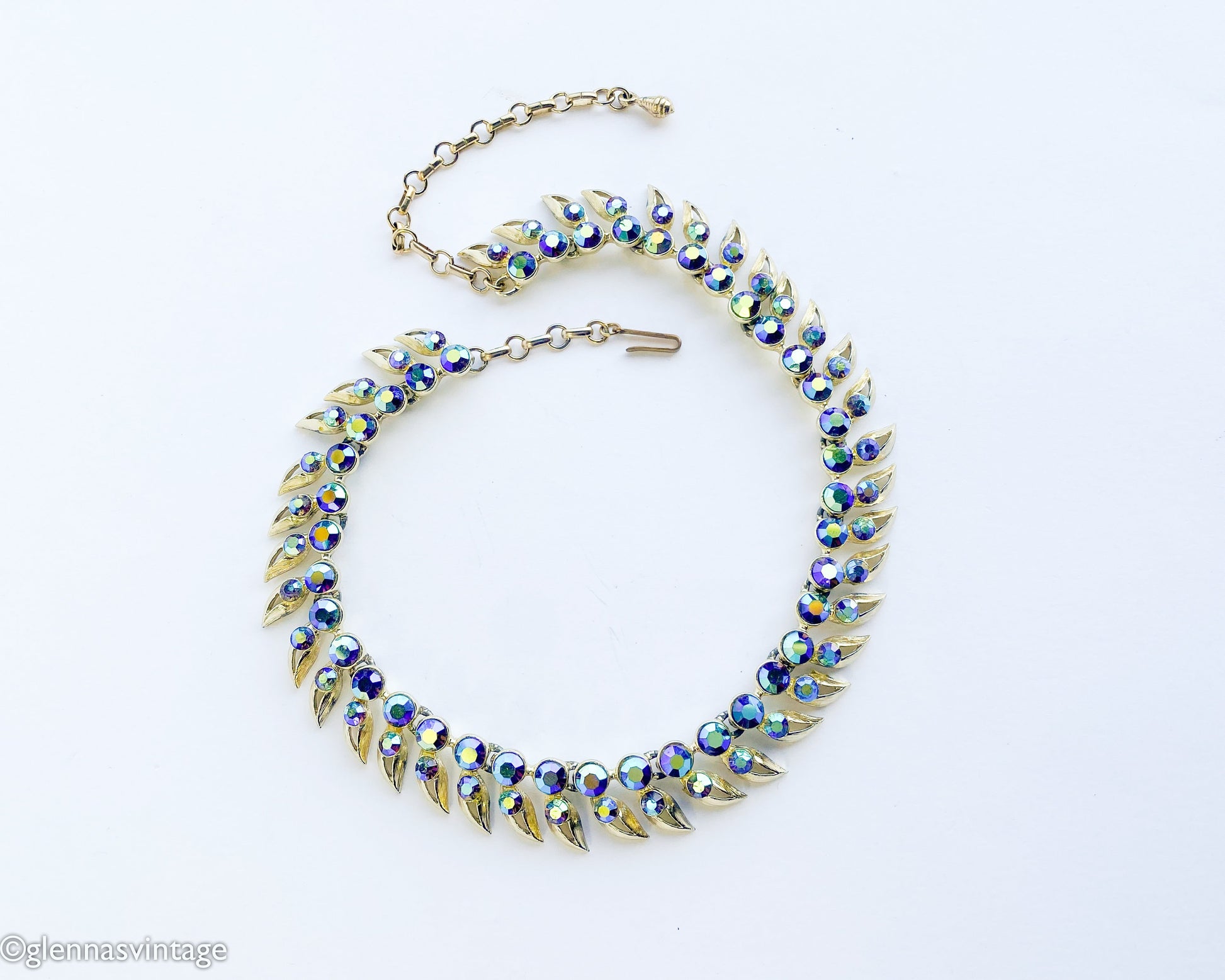 ~ 1950s lovely rhinestone evening necklace ~ Blue aurora borealis rhinestones ~ Leaf-like pattern ~ Gold metal setting ~ Adjustable size ~ Excellent Label: KRAMER Length- 17” (43.18 cm) Width- 1/2” (1.27 cm) More Incredible Vintage: http://glennasvintageshop.etsy.com Instagram @glennas_clothing Facebook https://www.facebook.com/glennasclothing