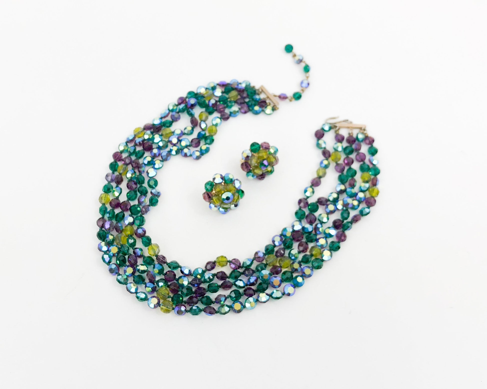 Vogue | 1960s Blue Green Crystal Necklace Set | 60s Green Faceted AB Crystal Set | Blue Multi Strand Necklace & Earrings | Vogue