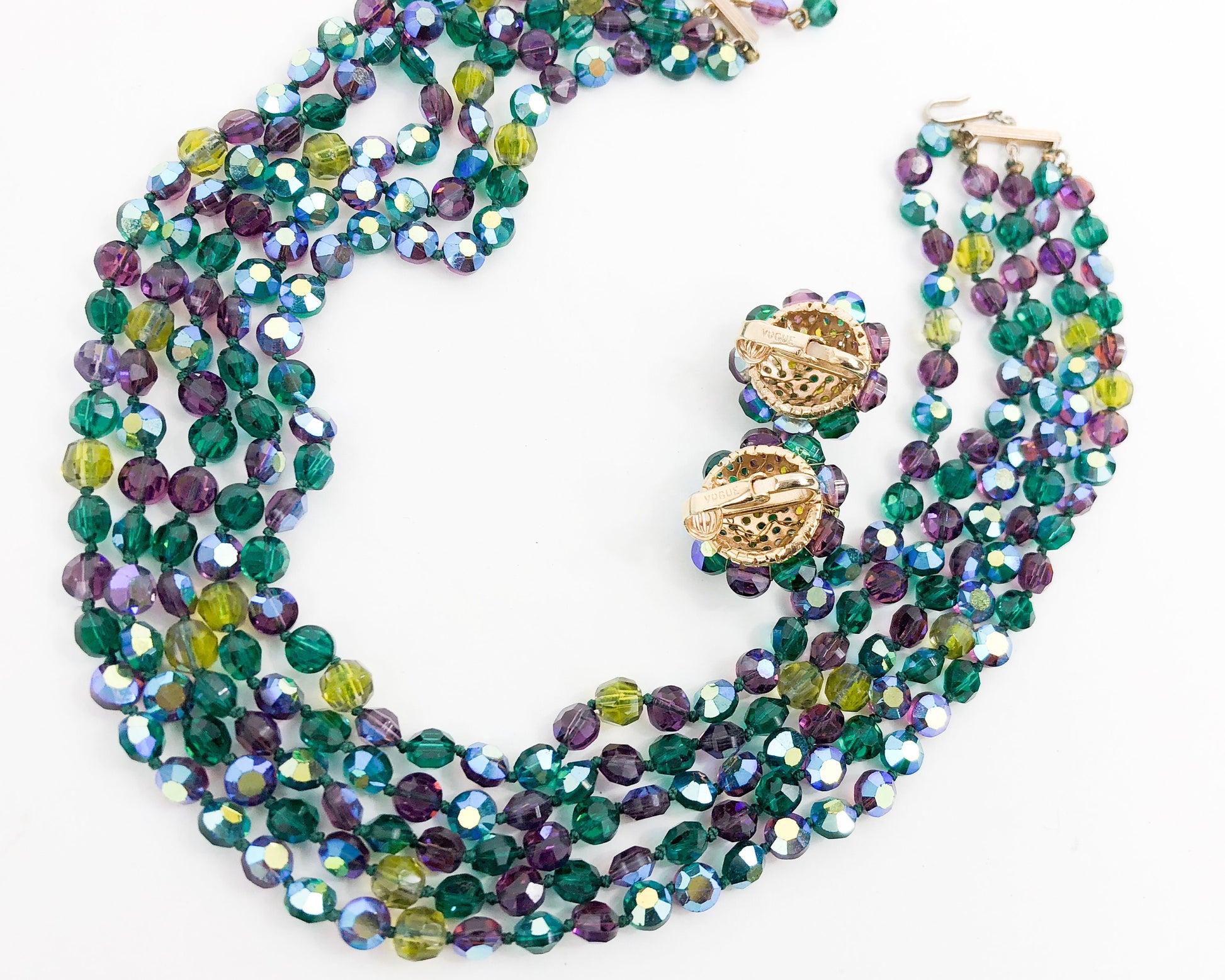 ~ 1960s brilliant green & purple faceted crystal necklace set ~ 5 strands of small aurora borealis crystal beads ~ Matching clip earrings ~ Gold metal ~ Excellent Mark: Vogue Length- 17" (43.18 cm) Clips- 1" (2.54 cm) More Fantastic Vintage Jewelry: glennasvintageshop.etsy.com Additional Vintage in our sister shop Glenna's Jewels: glennasjewels.etsy.com Instagram @glennas_clothing Facebook https://www.facebook.com/glennasclothing
